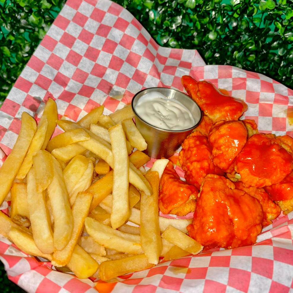 Deliciosas Piezas Grandes de pollo bañadas en la salsa de tu elección, acompañadas de papas fritas y porción de aderezo Ranch