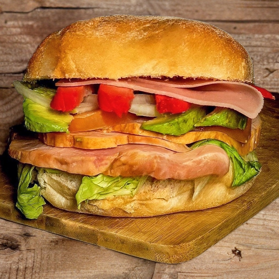 Queso, jamón, winny, aguacate, tomate, cebolla, lechuga y mayonesa.