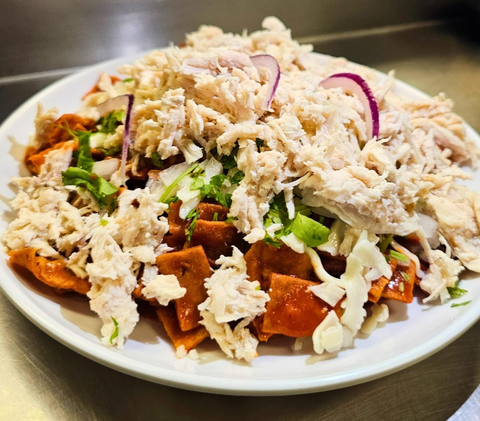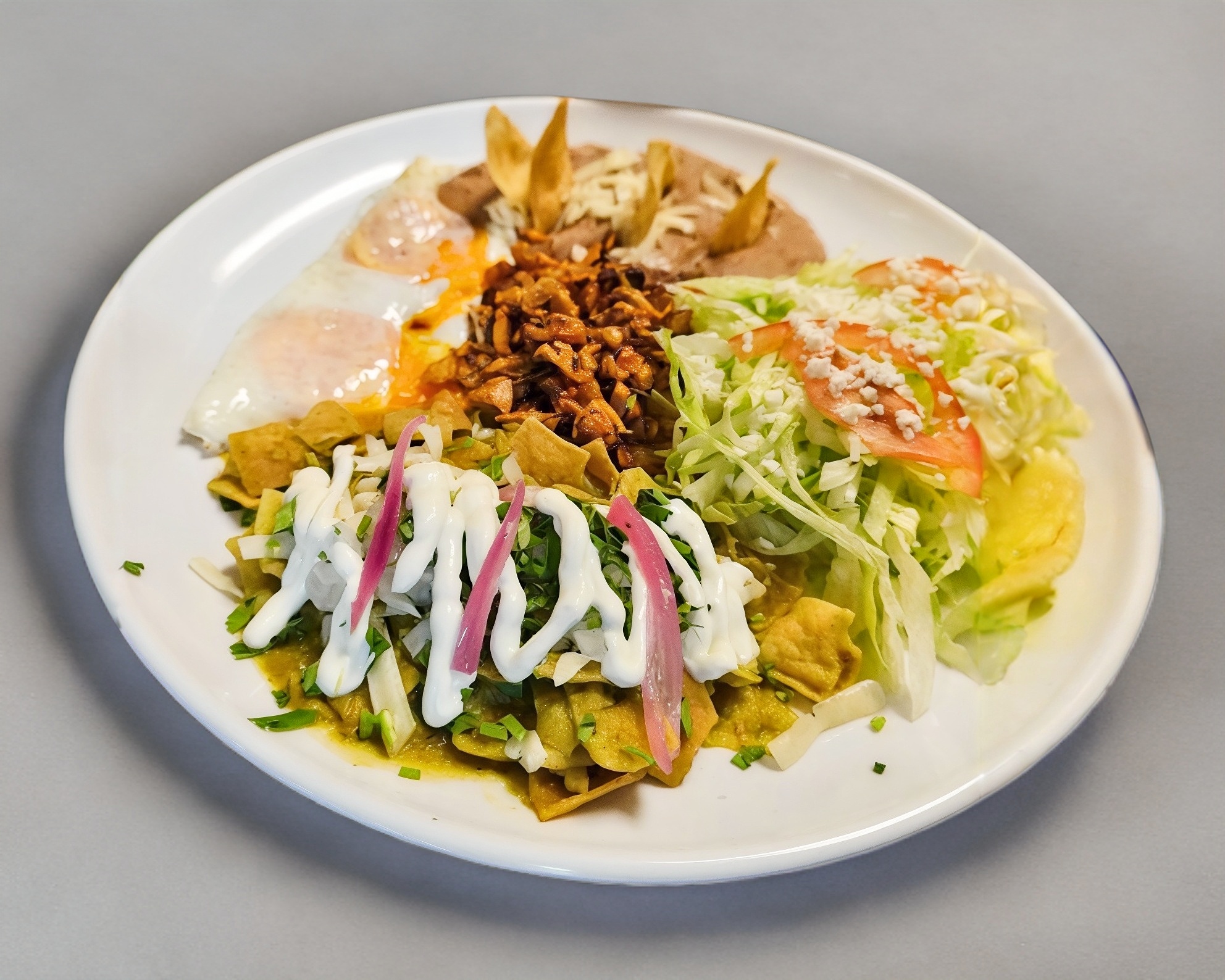 Chilaquiles rojos o verdes, acompañados de una generosa porción de pechuga de pollo desmenuzada, cebolla, cilantro, queso y crema.
