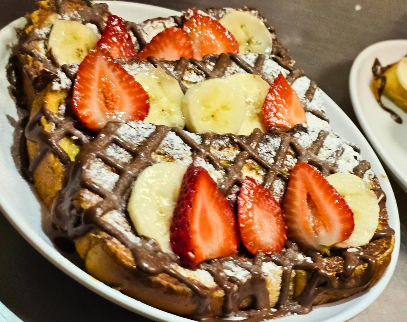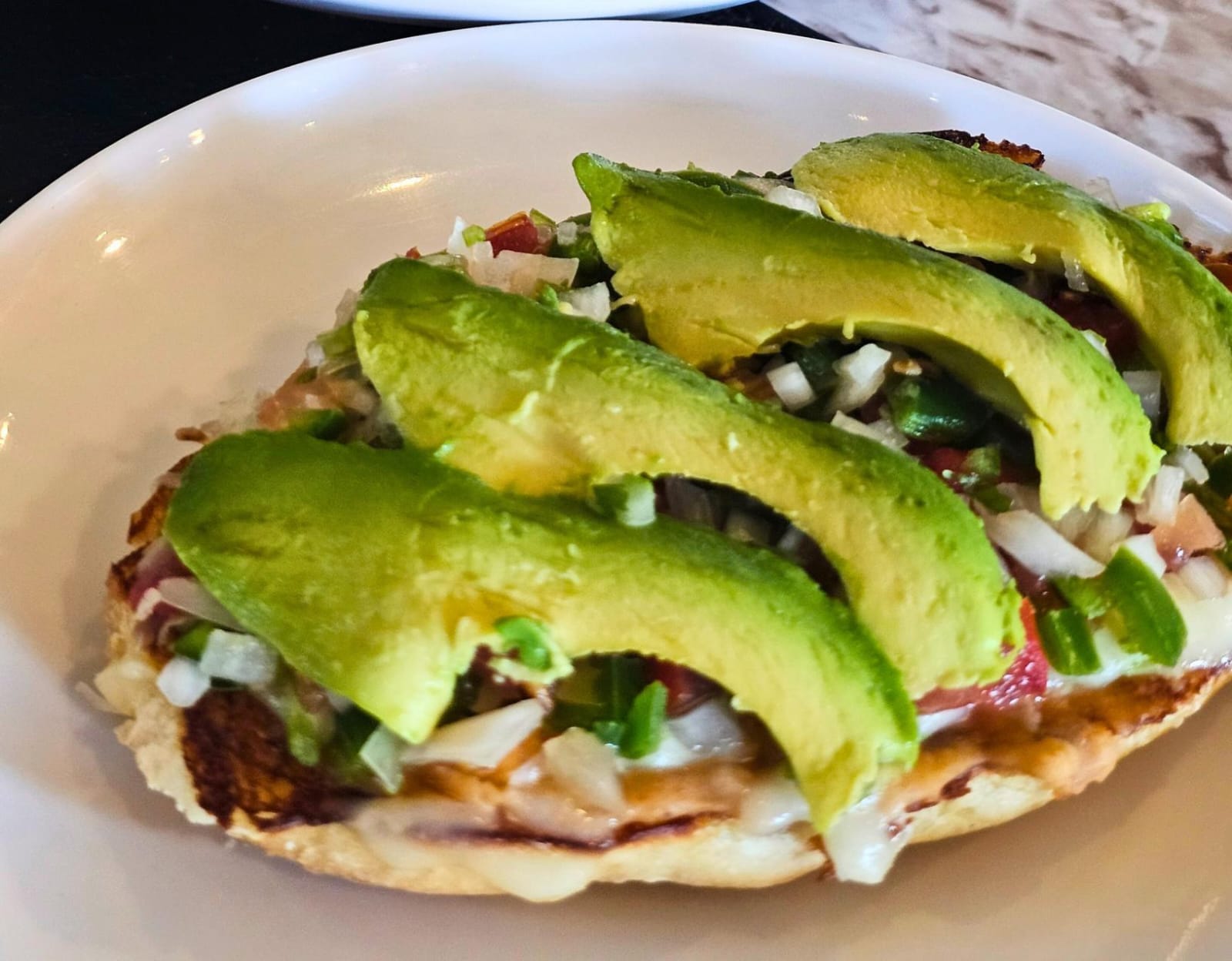 Nuestro delicioso pan tostado con mantequilla una base de frijoles y queso gratinado , aguacate y salsa pico de gallo