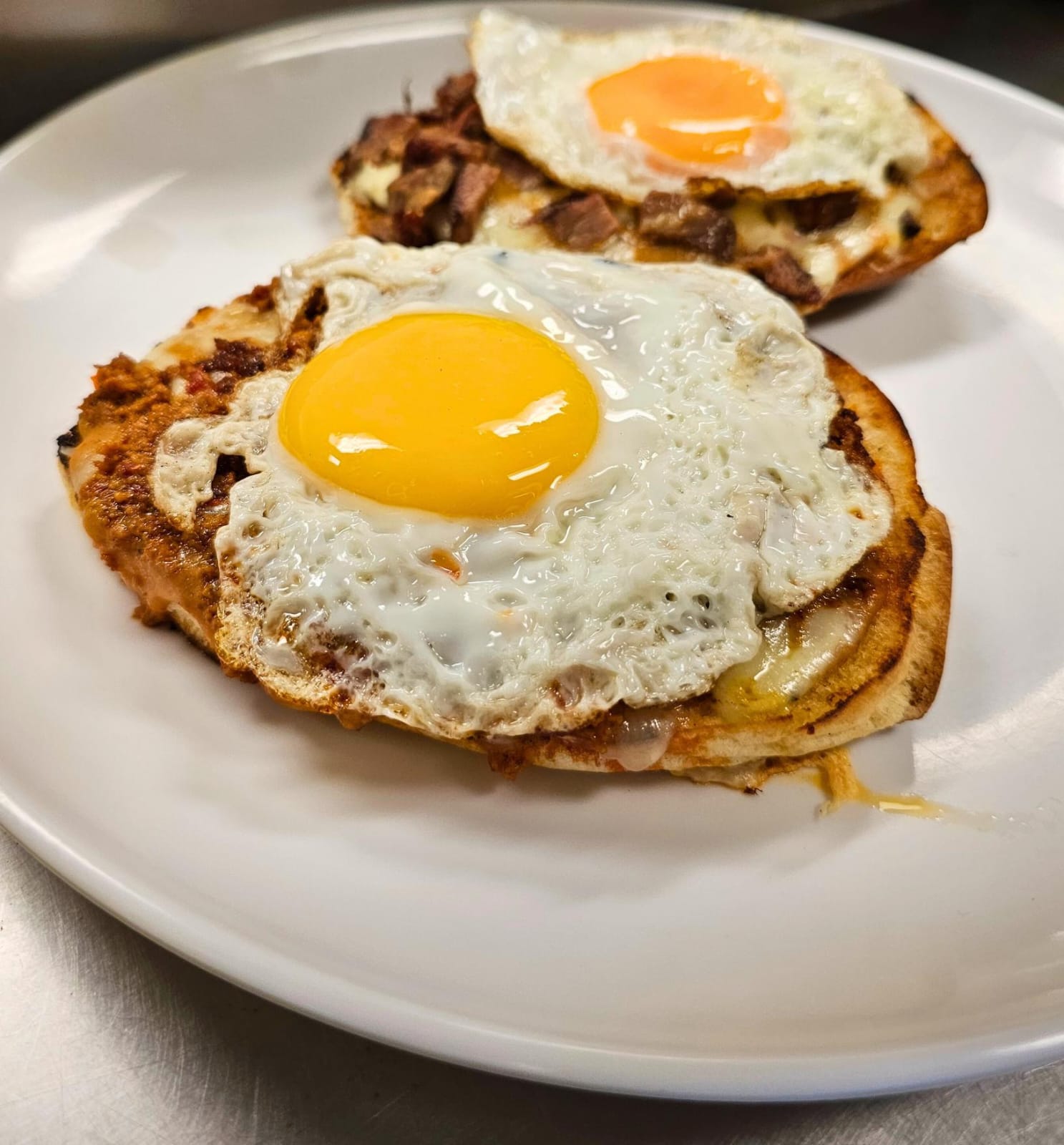 Dos huevos estrellados o revueltos, con cualquier guisado servido con guarniciones