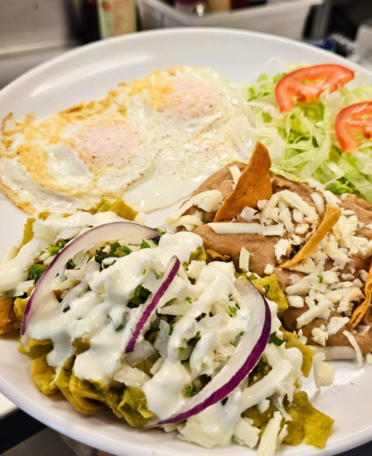 Totopos crujientes bañados en salsa, espolvoreados con cebolla, queso, crema y cilantro. montados con 2 huevos al gusto