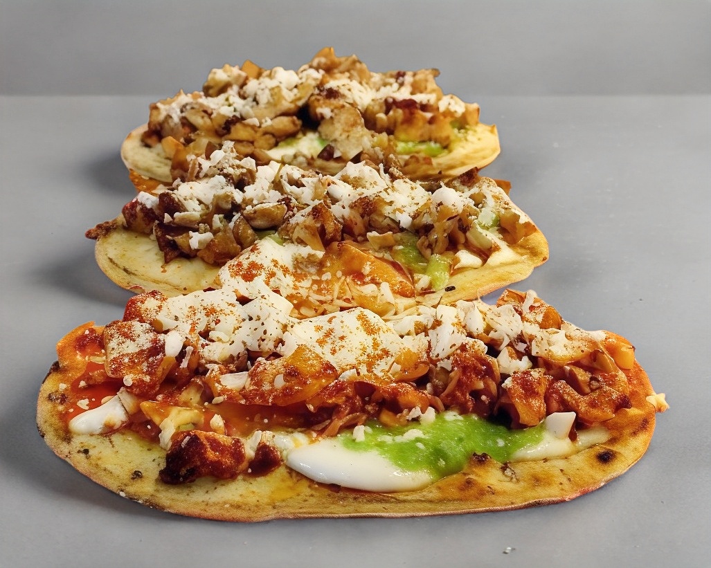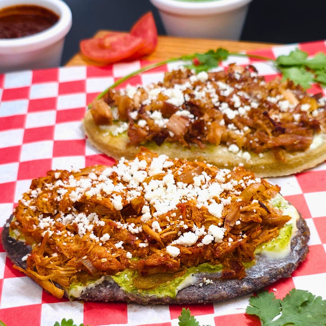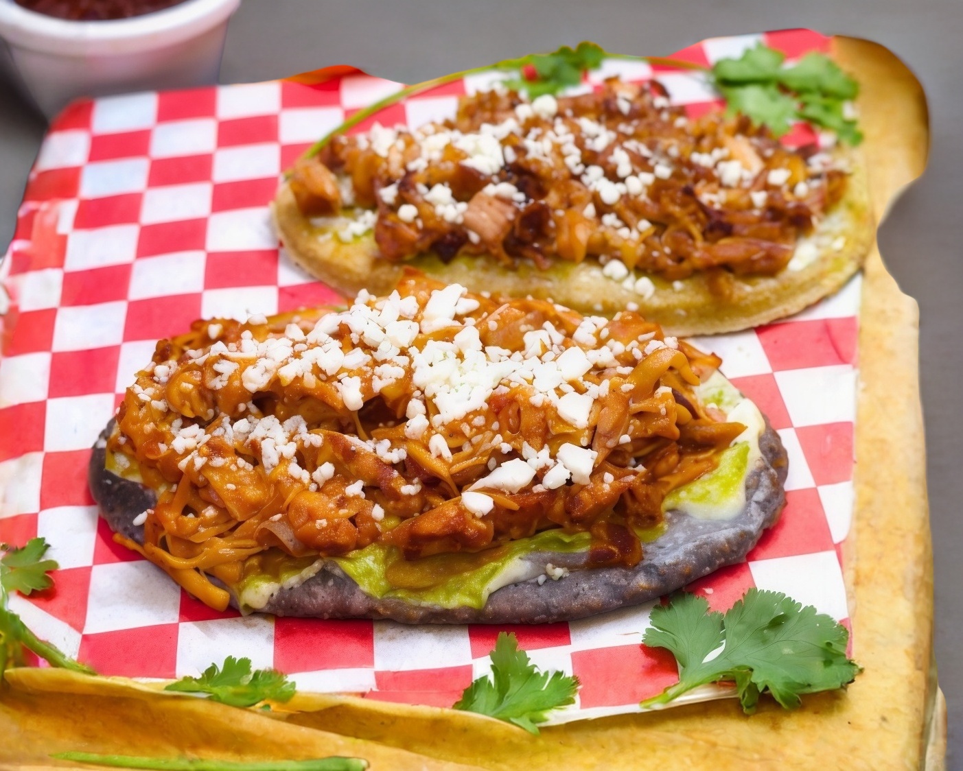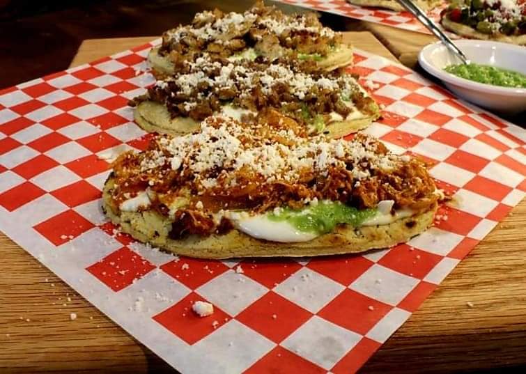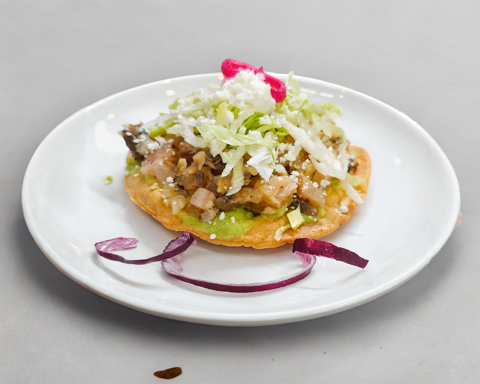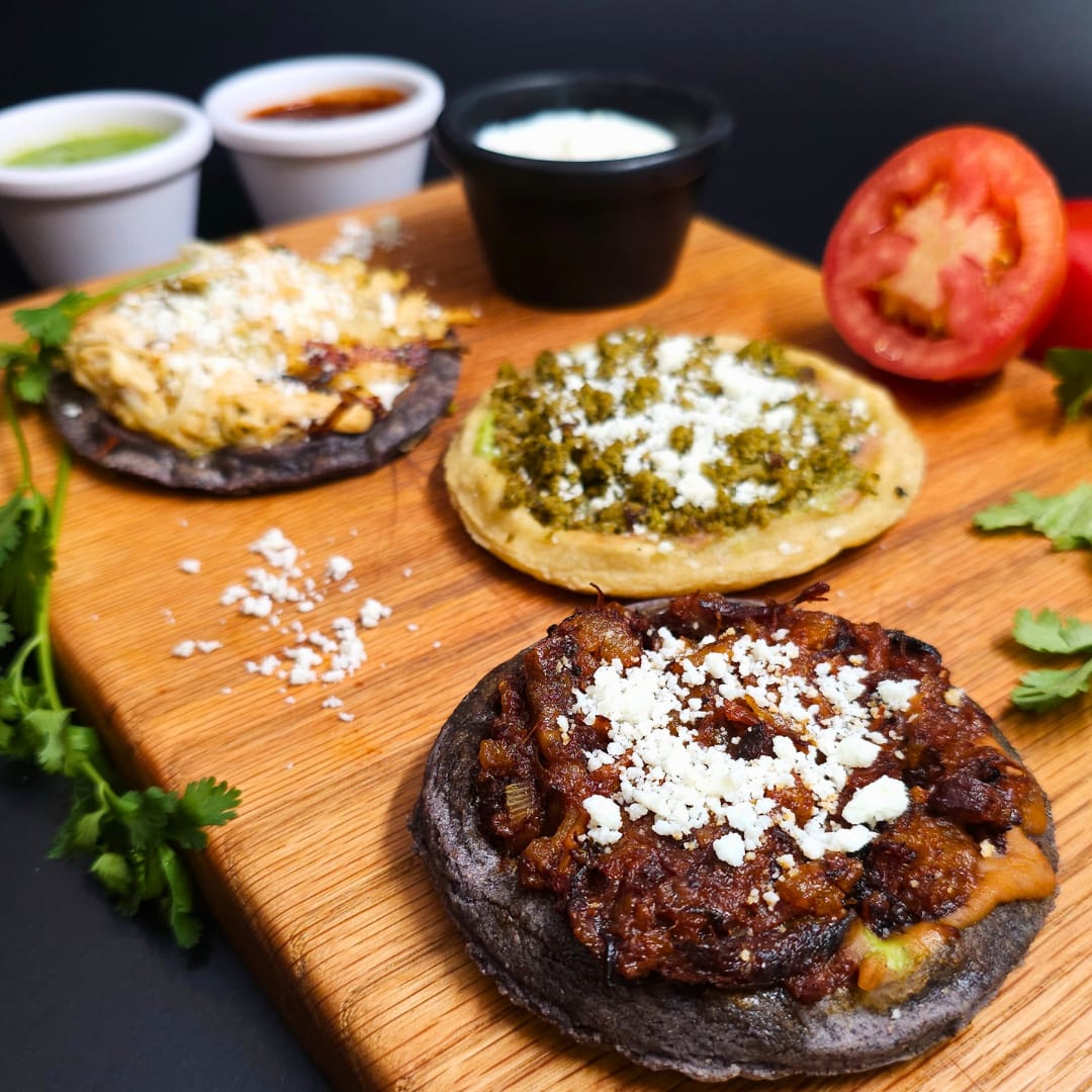 Tortilla pellizcada artesanal, presentada con una cubierta de frijoles, salsa verde de aguacate, el guisado de tu preferencia y espolvoreada con queso fresco.