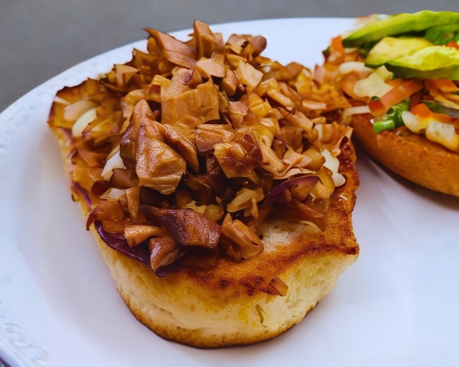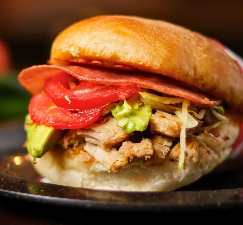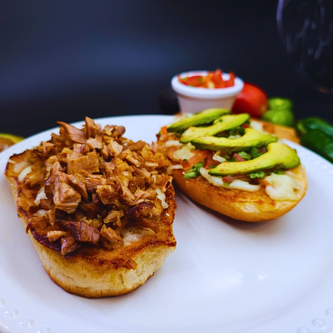 Pan partido a la mitad, frito con mantequilla, frijoles untados, jamón, queso, aguacate, lechuga y tomate.