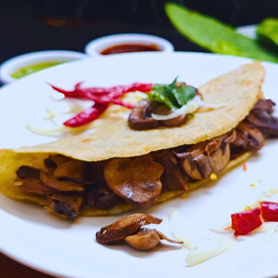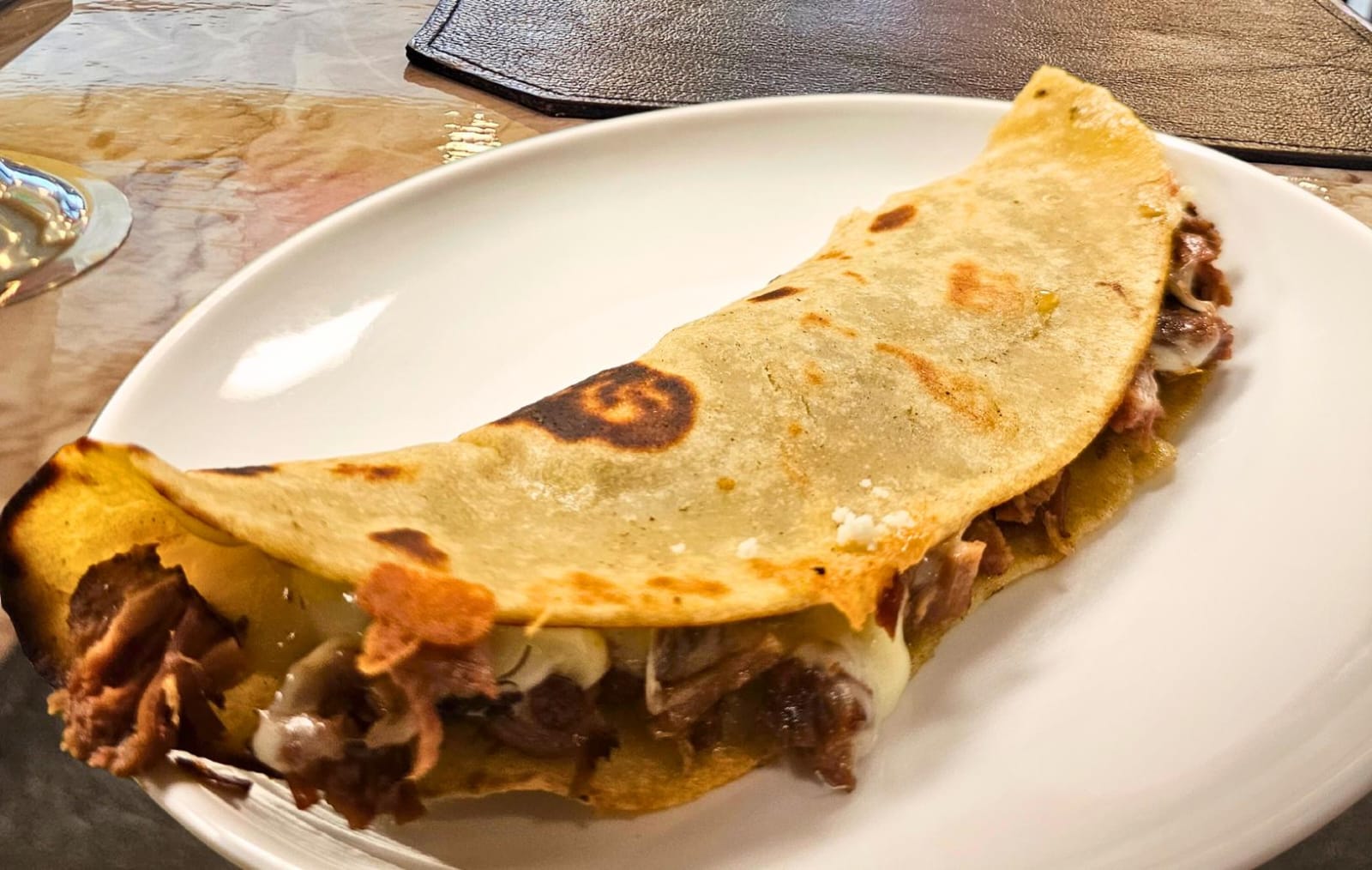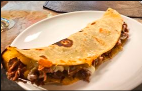 Tortilla artesanal ovalada rellena de guisado y queso.