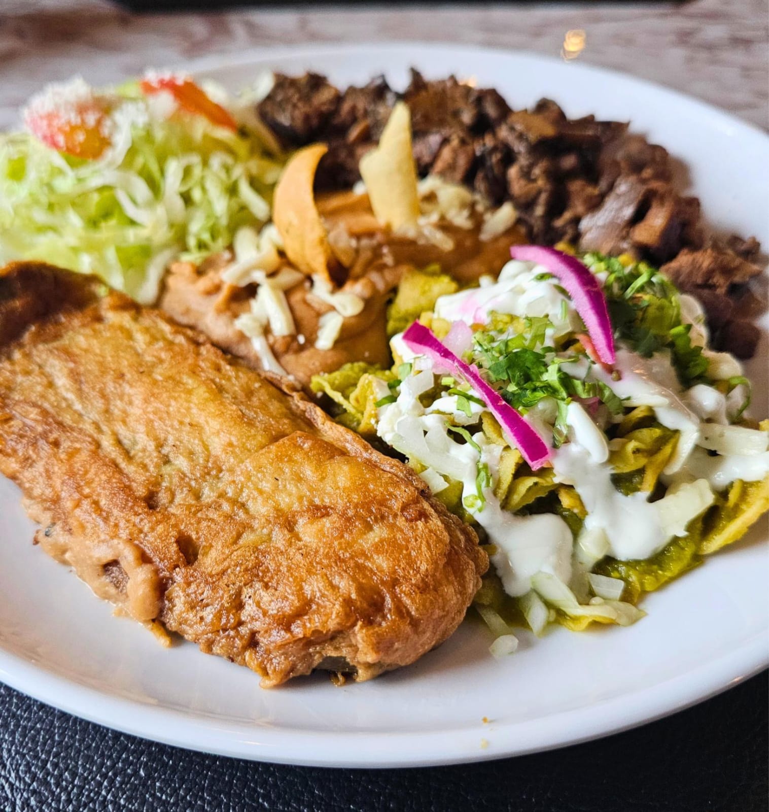 Con chilaquiles rojos o verdes, frijoles, ensalada y 2 chiles rellenos