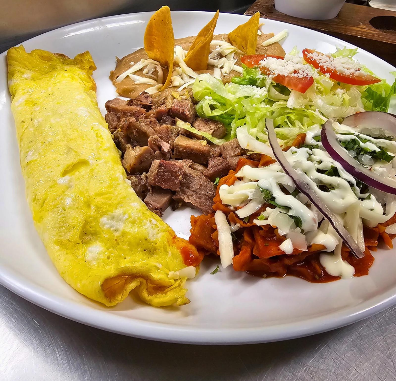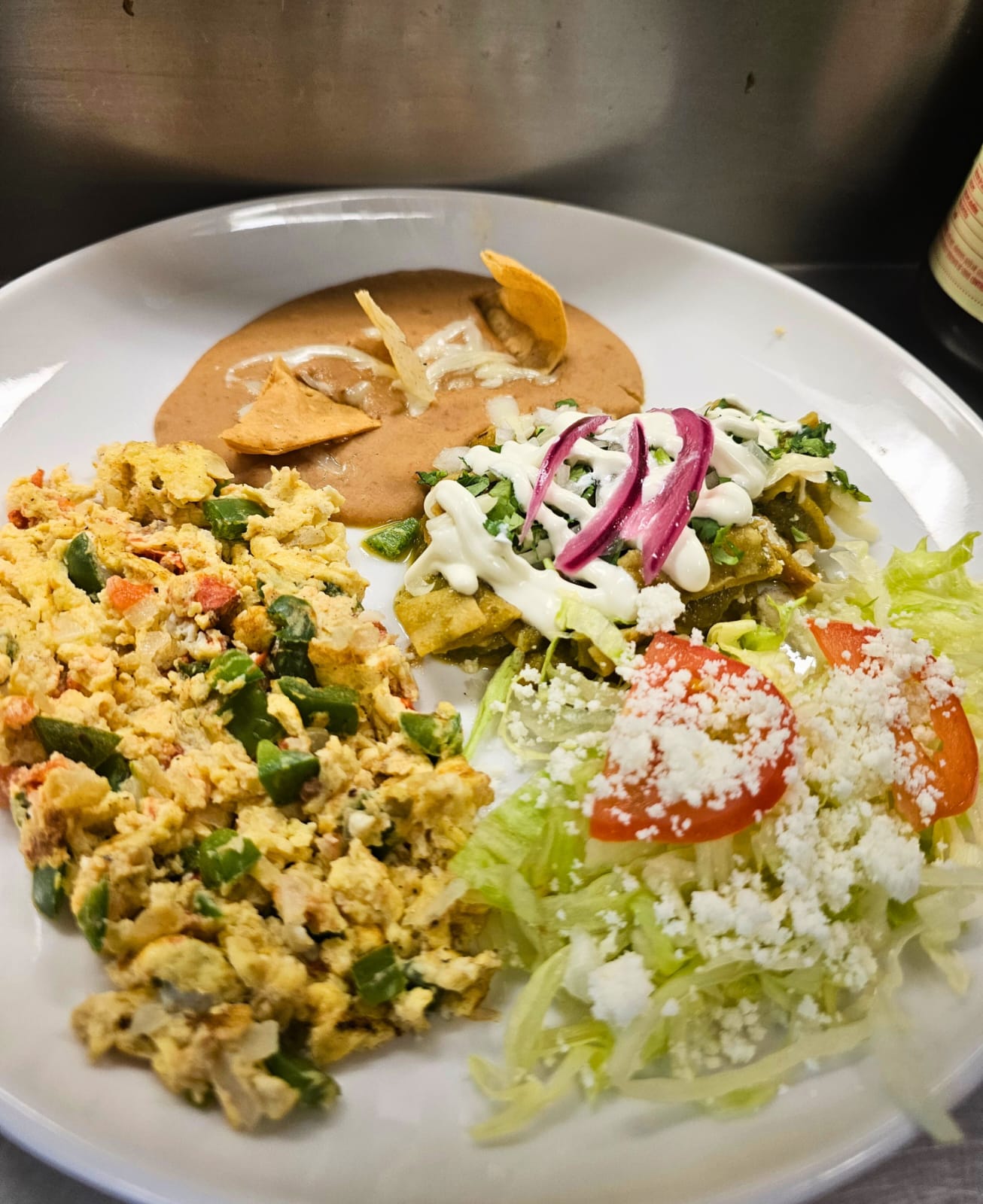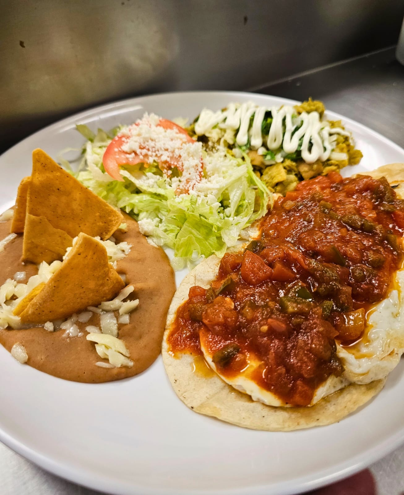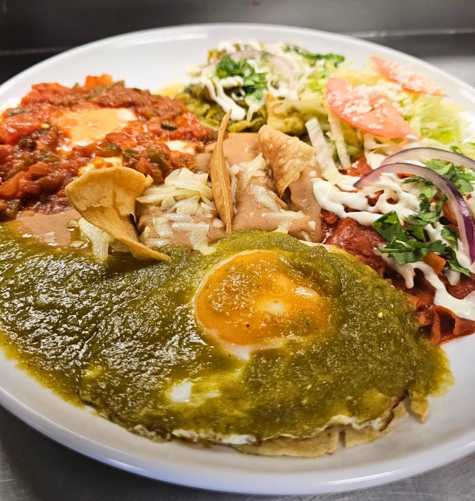 Nuestros chilaquiles rojos o verdes, acompañados de una generosa de cualquiera de nuestros guisados