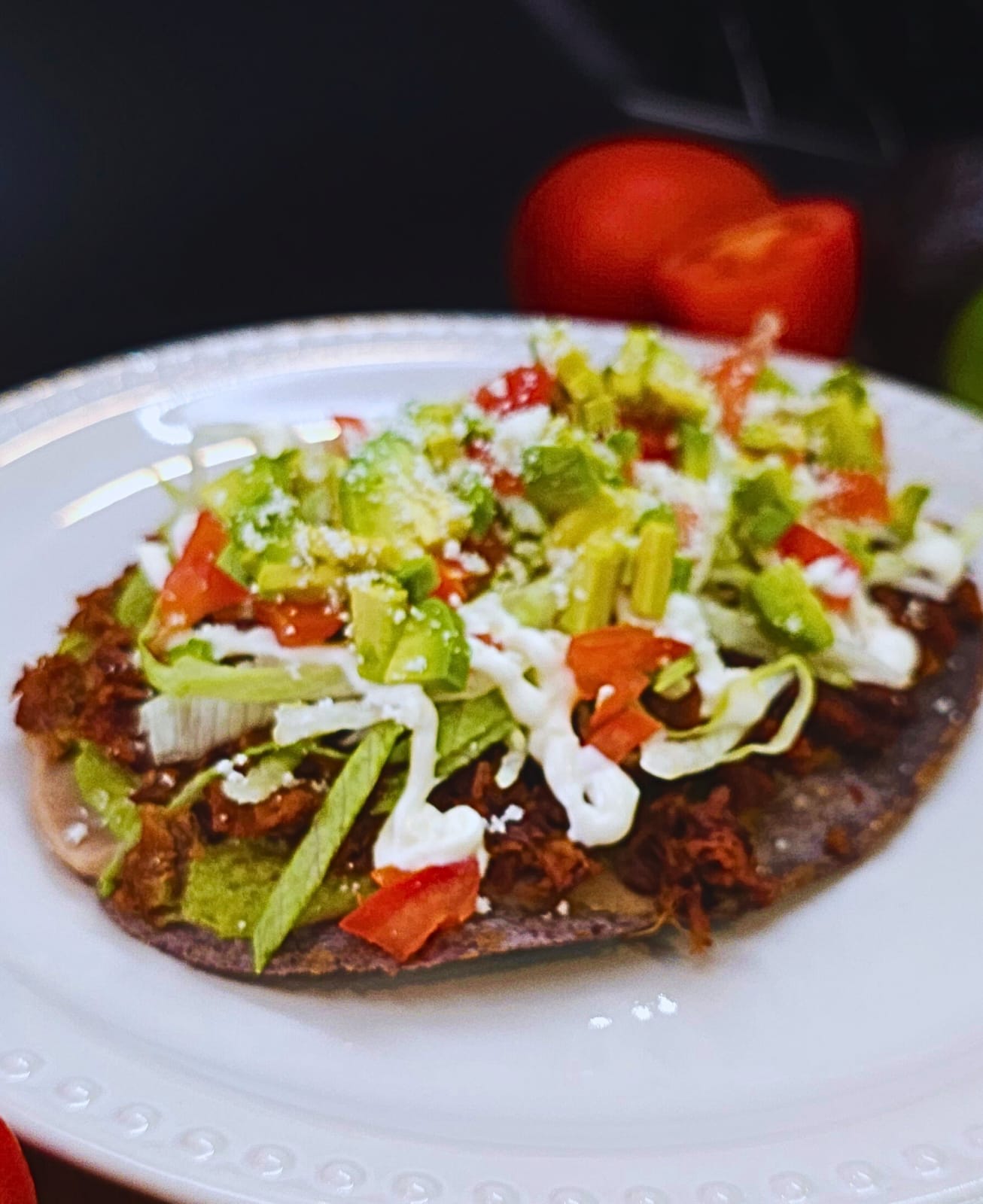 tortilla delgada ovalada grande de 24cm preparada con una cama de frijoles, salsa verde de aguacate y guisado de tu elección, se monta una porcion generosa de lechuga, tomate aguacate crema y queso fresco