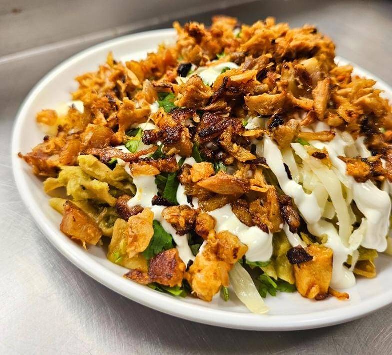 Totopos crujientes bañados en salsa, espolvoreados con cebolla, queso, crema y cilantro. cubiertos de una generosa capa de pollo