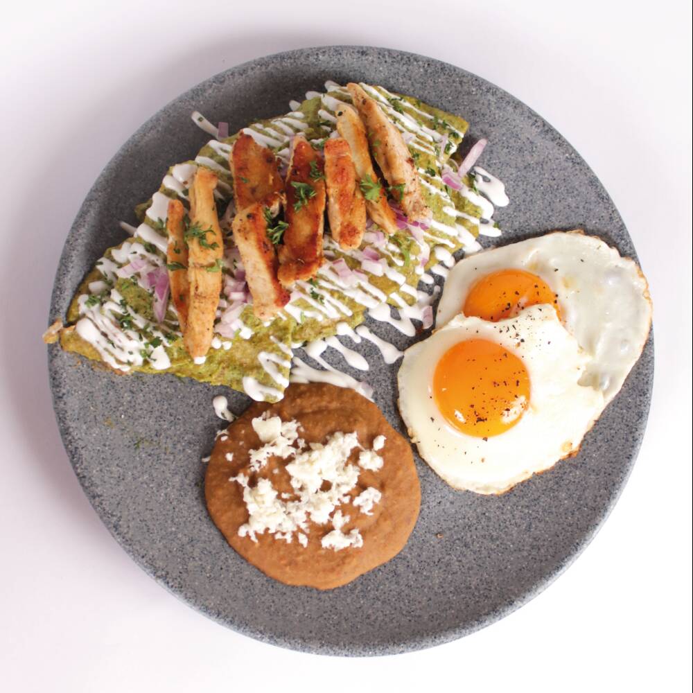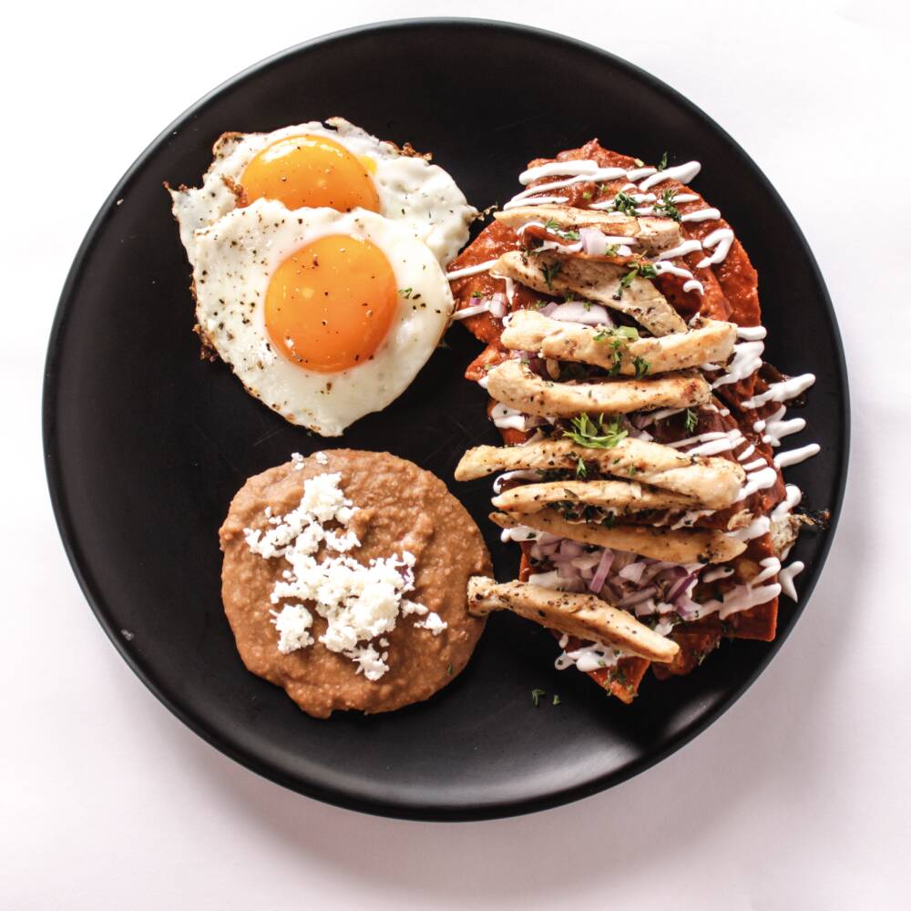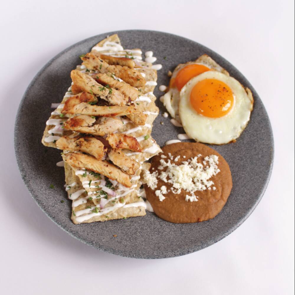 Totopos de maíz bañados en la salsa de tu preferencia. Coronados con crema fresca, queso panela, aguacate, cebolla morada, perejil y pollo. Acompañados de frijoles refritos y dos huevos al gusto.