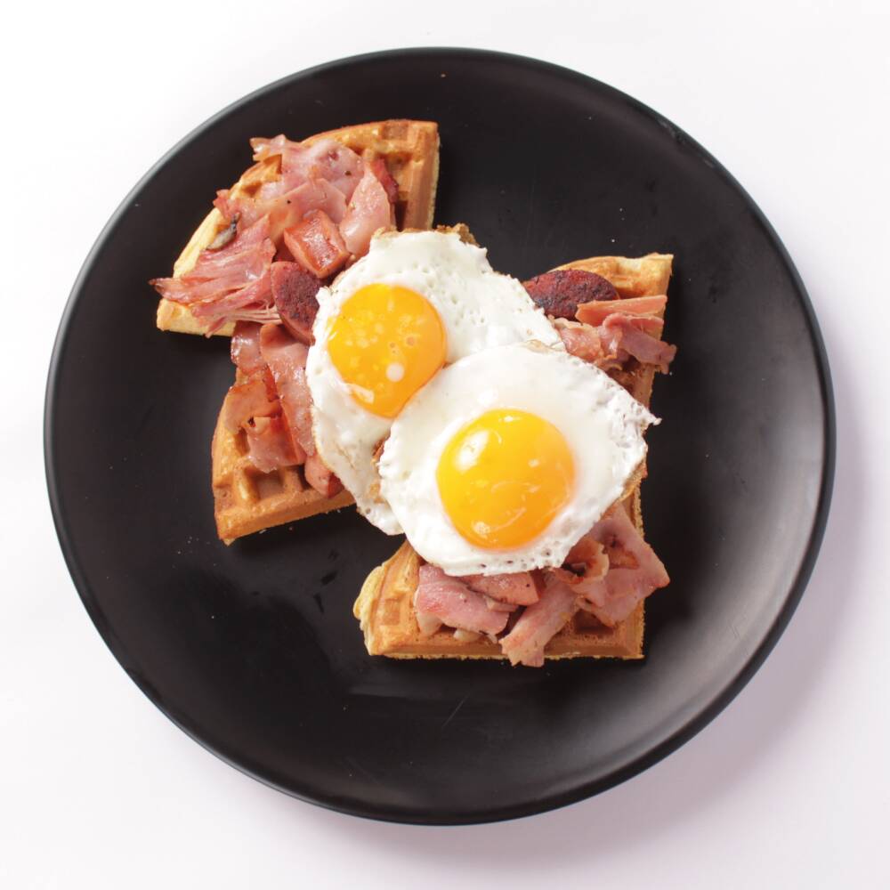 Waffle acompañado de miel de maple, tocino, jamón, salchicha polaca y dos huevos al gusto.
