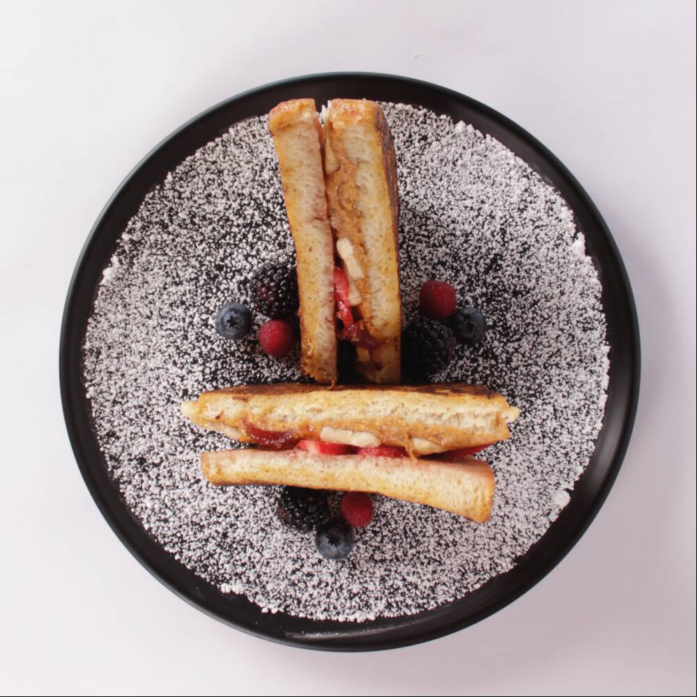 Rebanadas de pan artesanal sumergidas en una mezcla de pan frances de la casa, rellenas de crema de cacahuate y mermelada de fresa, acompañadas de fruta fresca, miel de menta y un delicado toque de azucar glass.