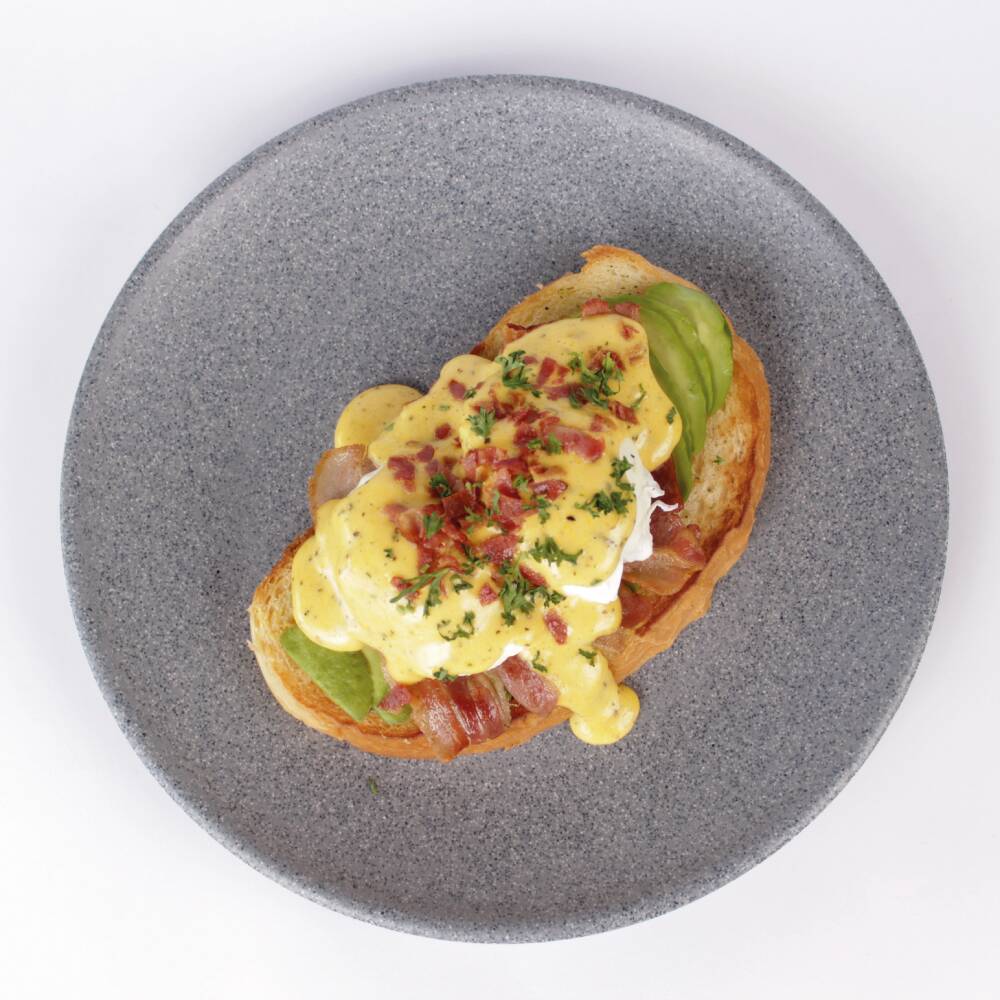 Pan artesanal crujiente con base de aguacate, tocino, dos huevos pochados y salsa holandesa suave. Una combinación clásica y elegante para empezar el dia.