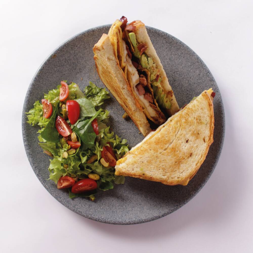 Pan brioche de la casa relleno de un omelette con salchicha polaca, chorizo, espinaca, aguacate y queso mozzarella, con aderezo de chipotle. Acompañado de ensalada fresca de la casa.