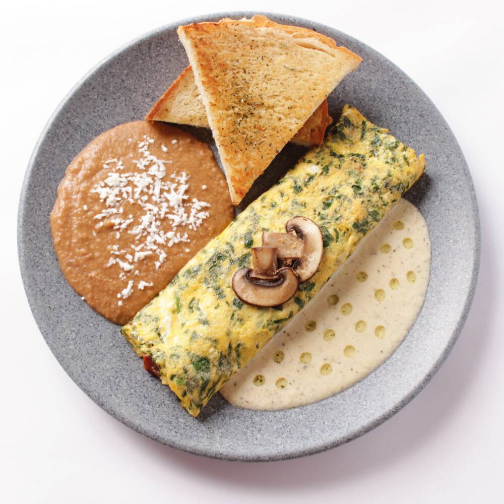 Omelette esponjoso relleno de sachicha polaca, queso Mozzarella, champiñones y espinaca. Servido con salsa wera a un lado. Acompañado de frijoles refritos y pan tostado de la casa.