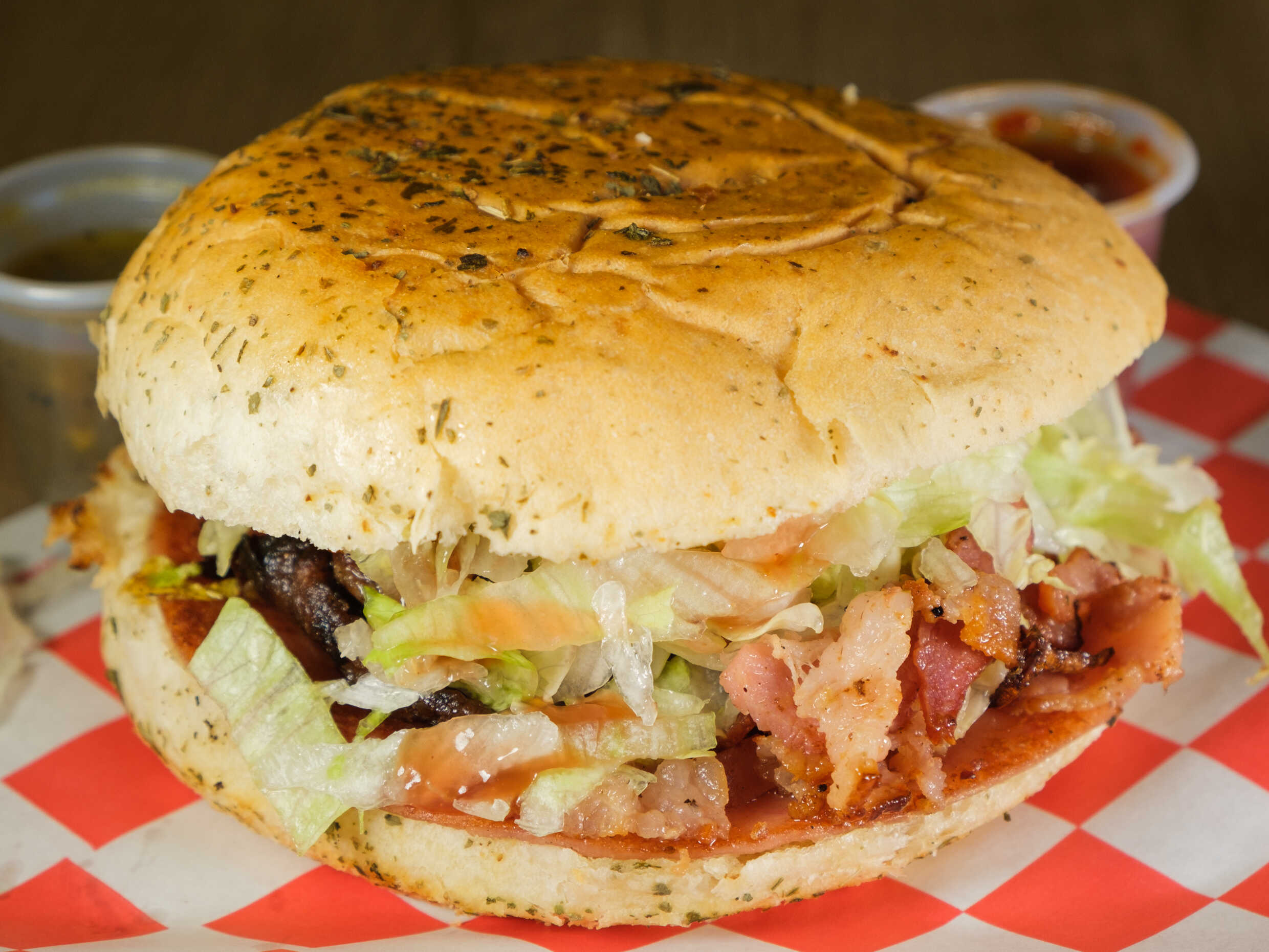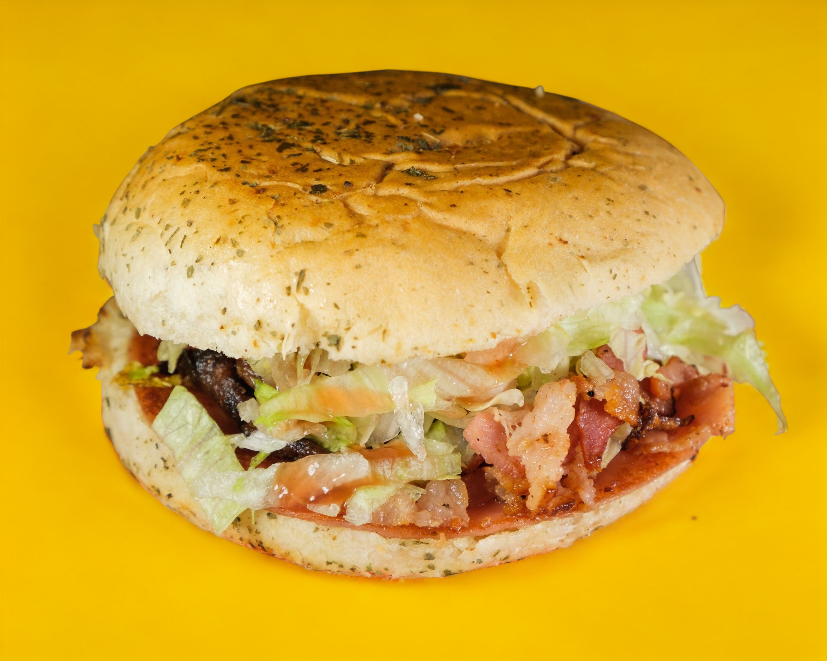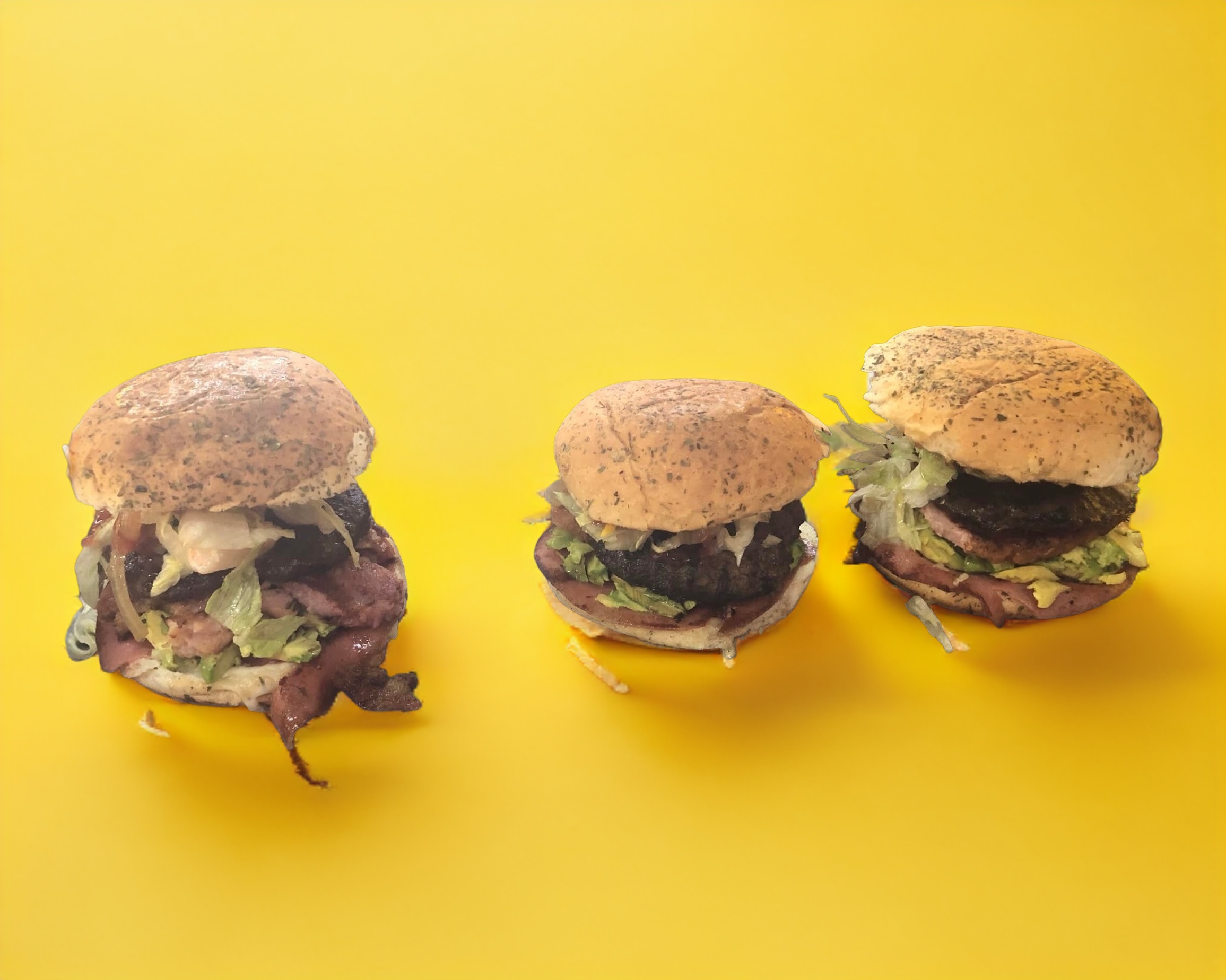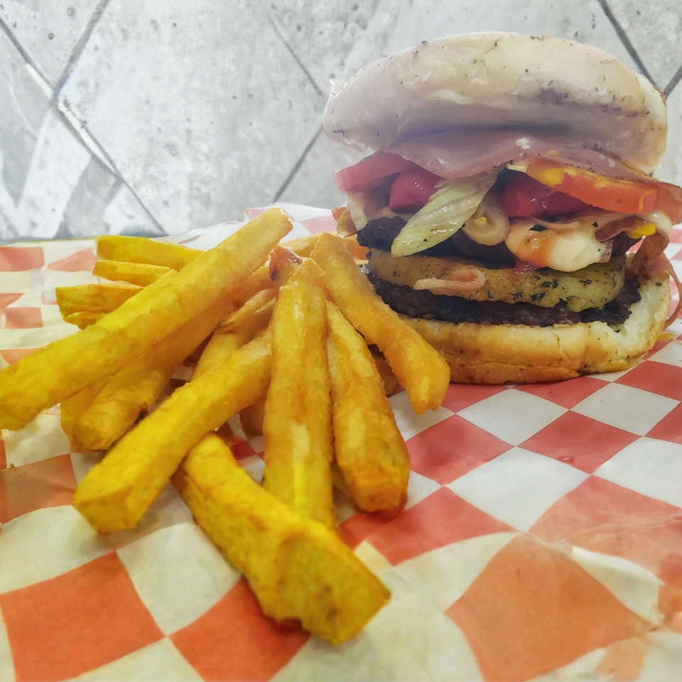 Pan, doble carne, jamón, queso, lechuga, cebolla, tomate y aderezos.