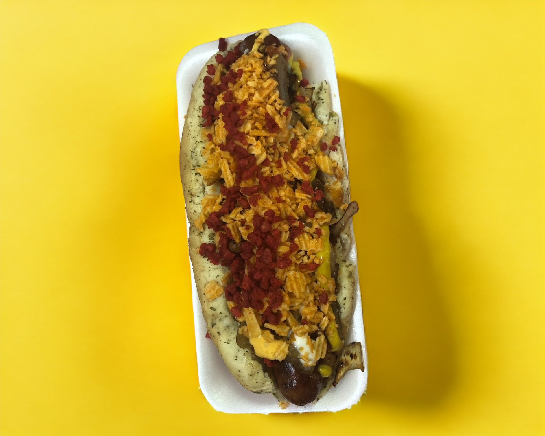 Salchicha de res, frijoles, chilli beans, cebolla, tomate, mayonesa, mostaza, cátsup, crema y queso amarillo.