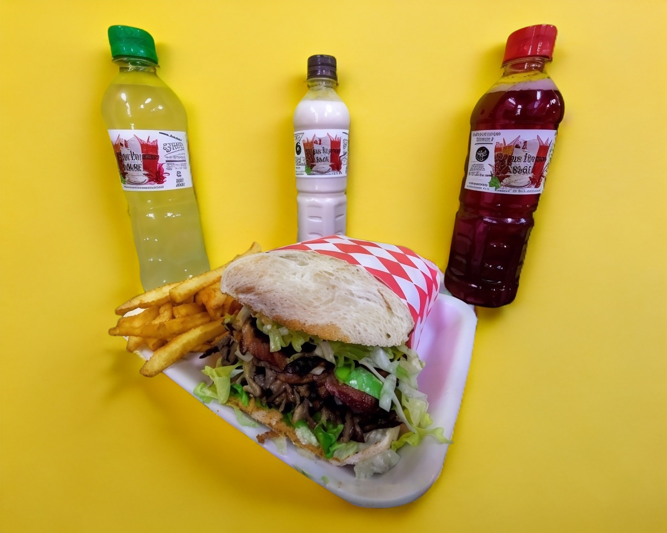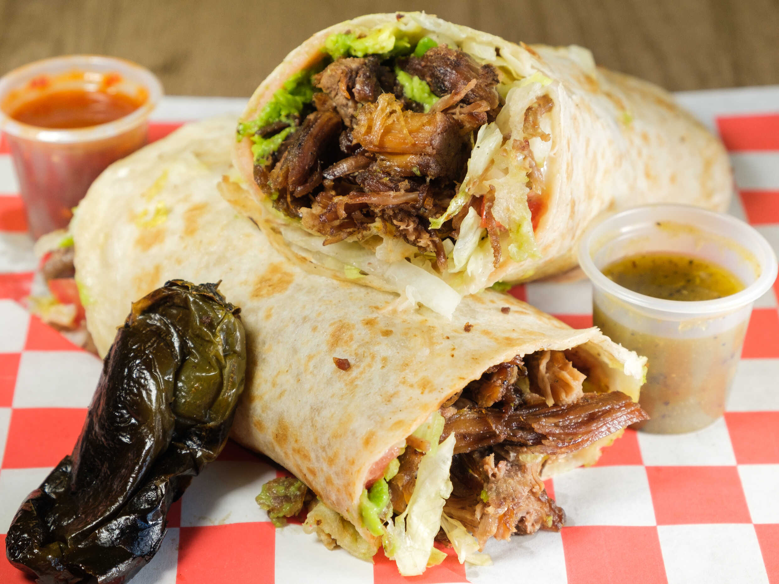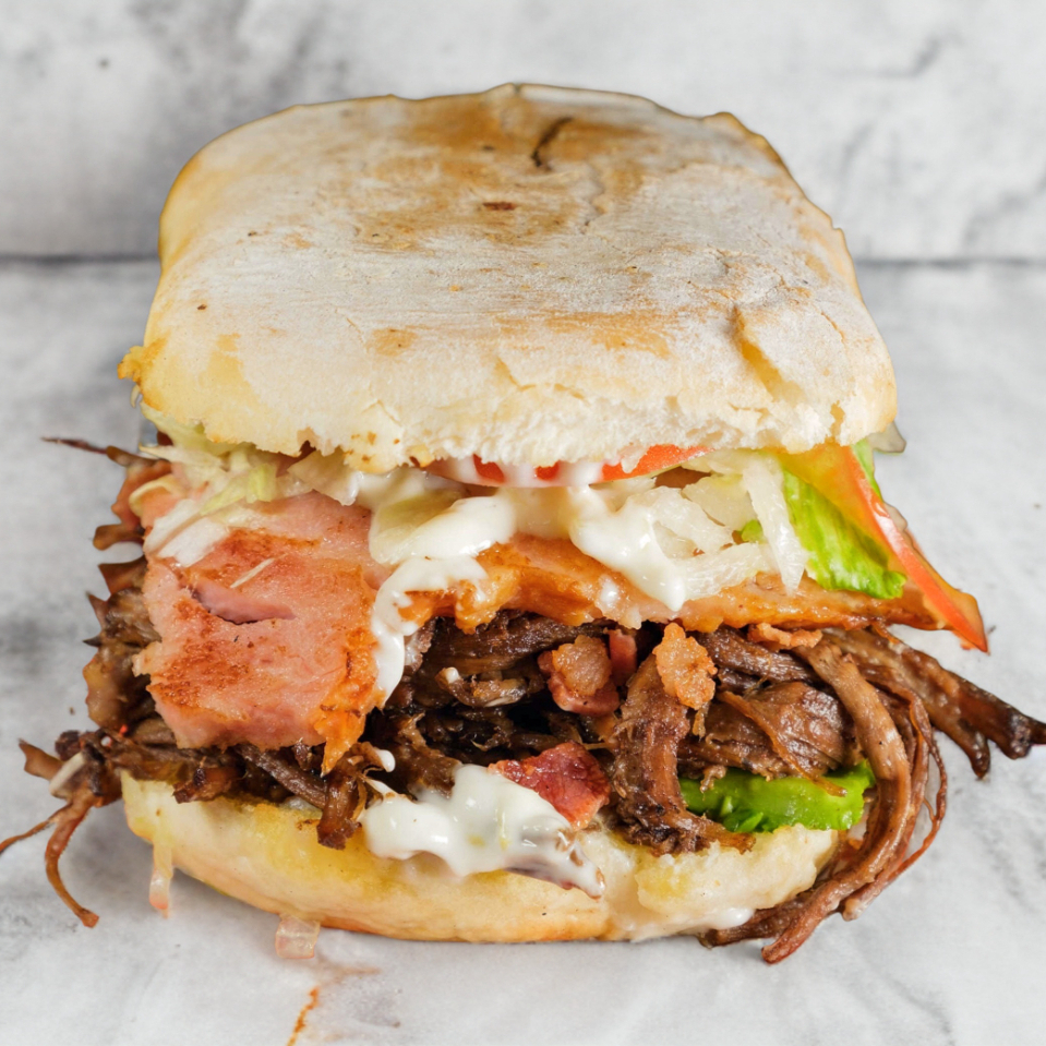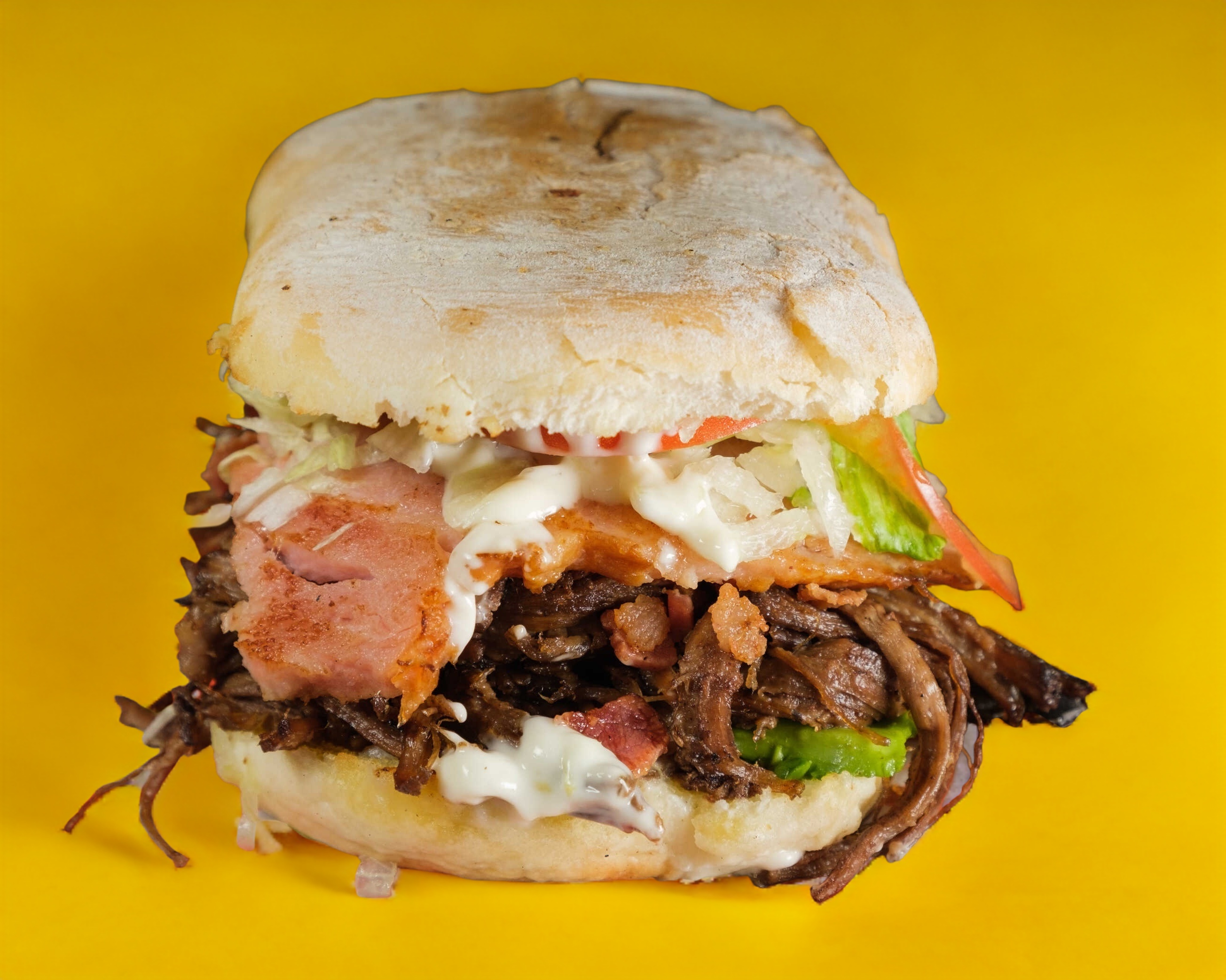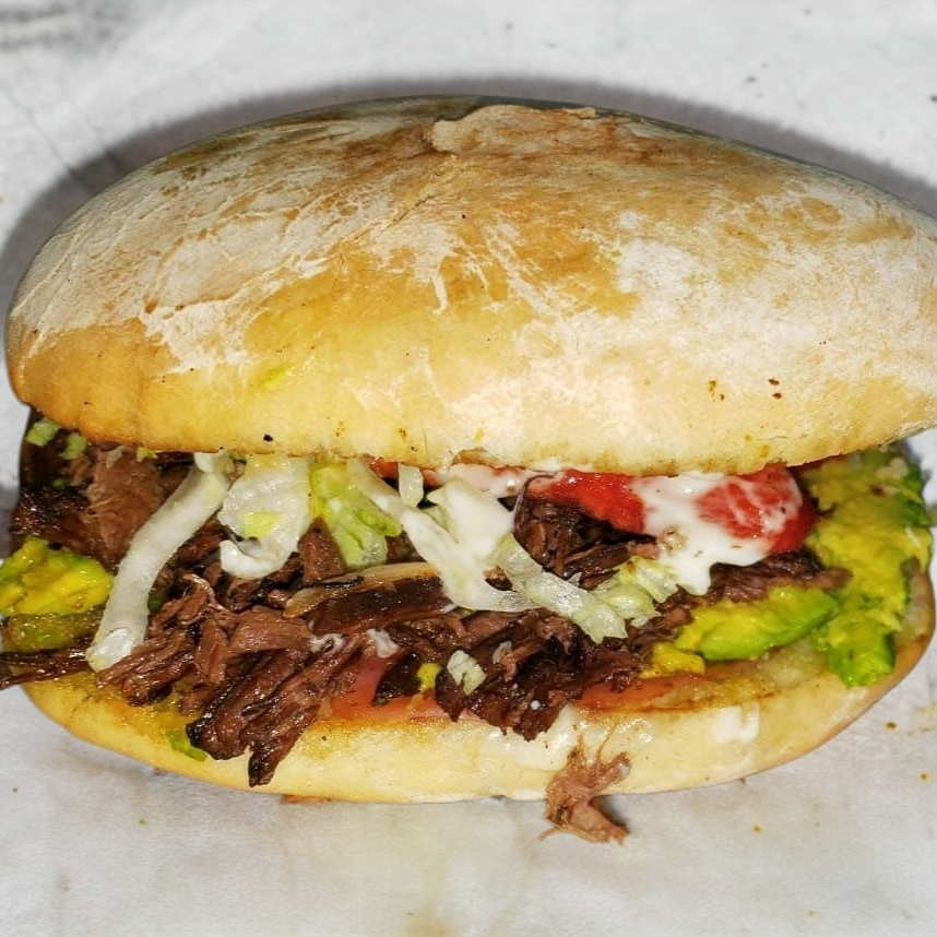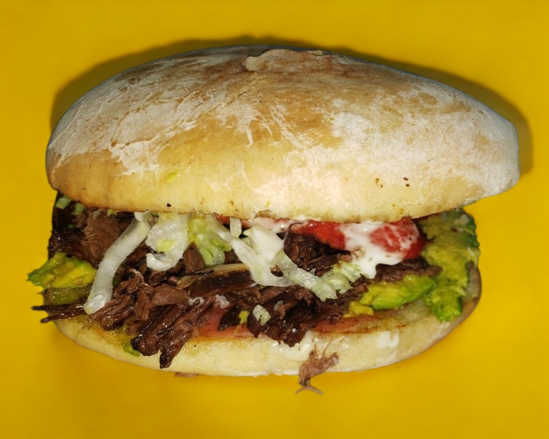 Tortilla, doble jamón, doble queso, lomo/bistec, aguacate, lechuga, tomate, cebolla y mayonesa