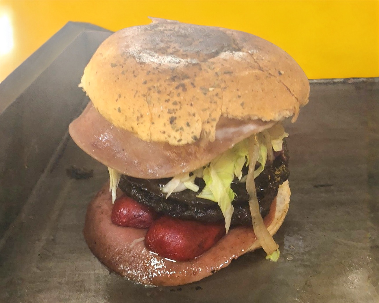 Pan, 2 carnes, 2 jamones, 2 quesos, salchicha campestre, tocino, piña, lechuga, cebolla, tomate y aderezos.