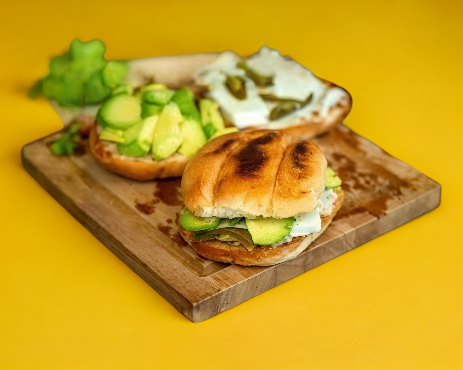 Pan, bistec, aguacate, jamón, queso y verdura.