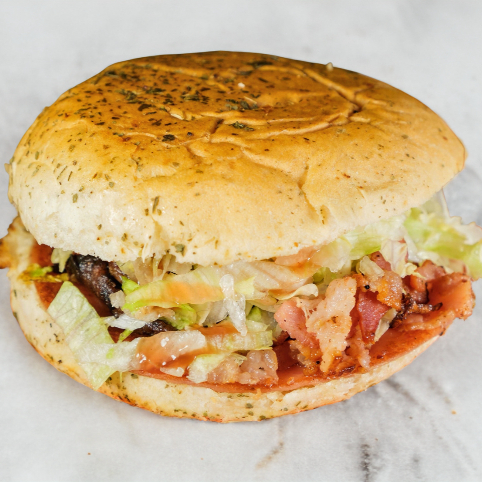 Pan, deliciosa carne de costilla (250 g.), jamón, queso, tocino, aguacate, lechuga, cebolla, tomate y aderezos.
