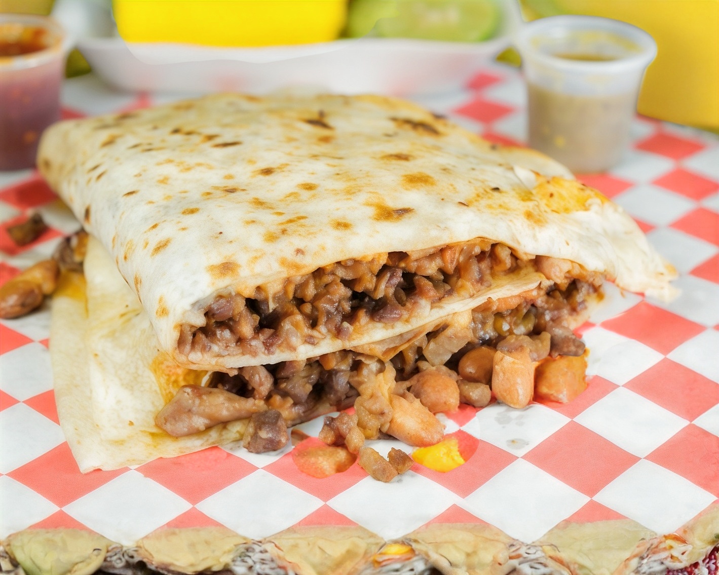 Bistec, chilli beans, asadero, verdura al gusto.