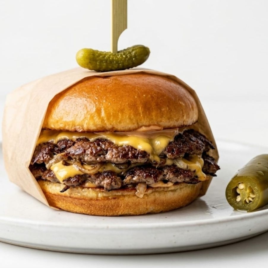 Hamburguesa super clasica Smashburger, carne de res 150gr total ,con queso, aderezo especial, pepinillo mini y chile encurtido.