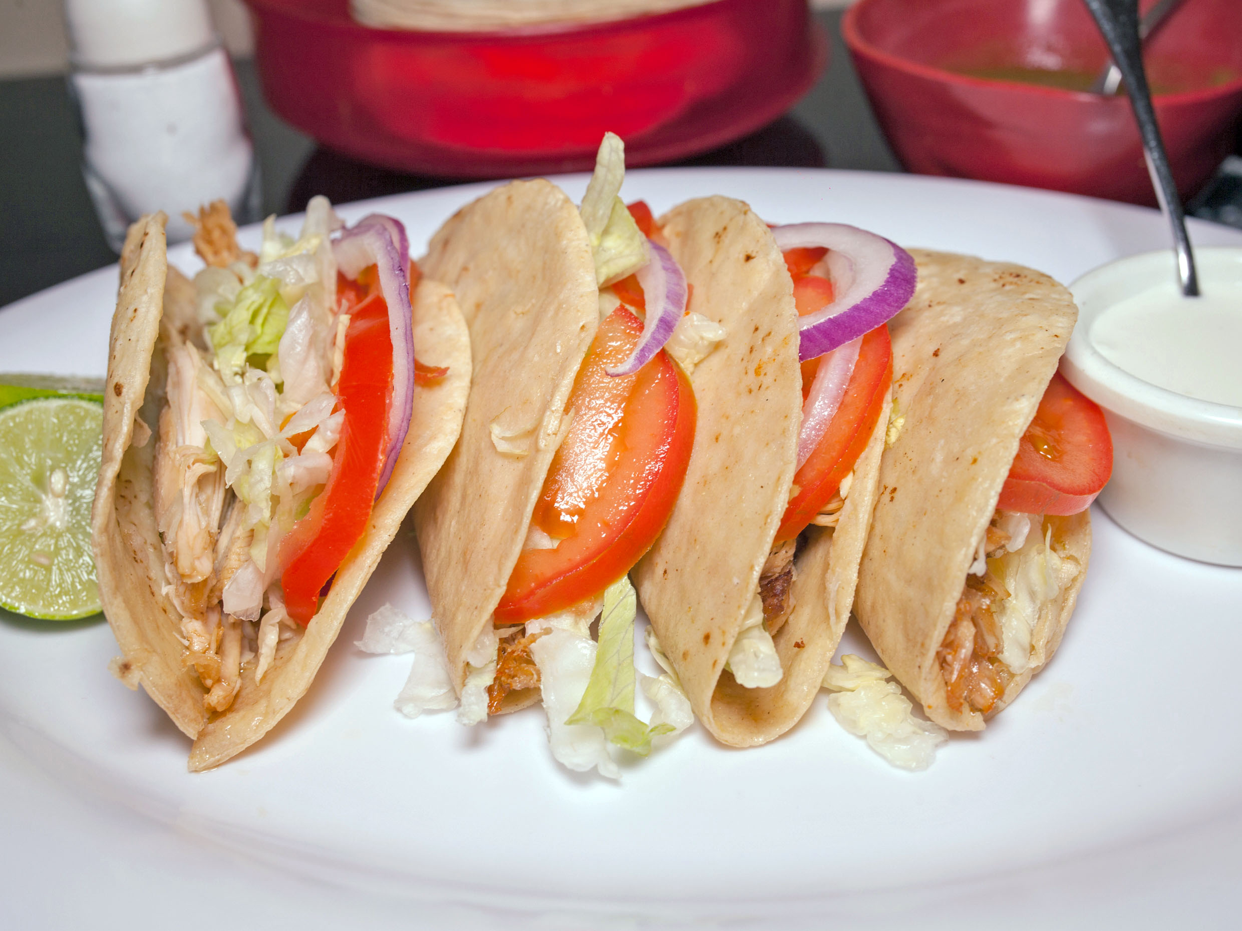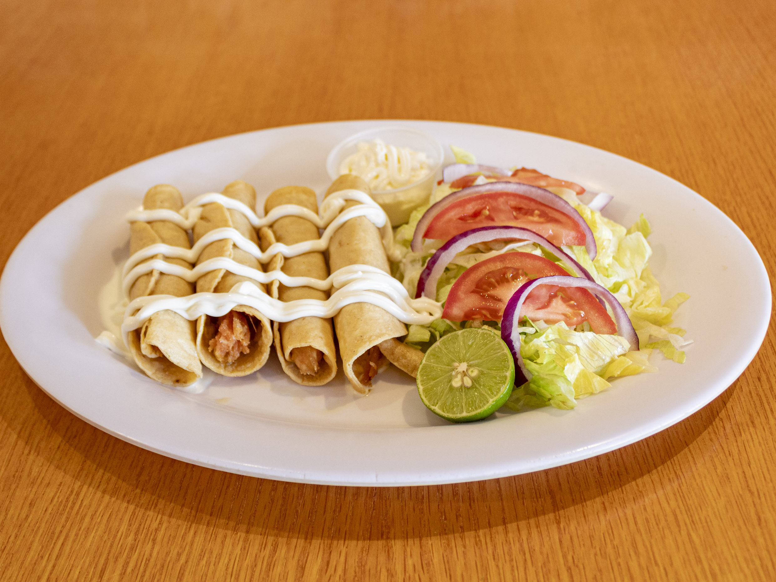 4 deliciosos tacos dorados con pollo, lechuga, tomate y cebolla