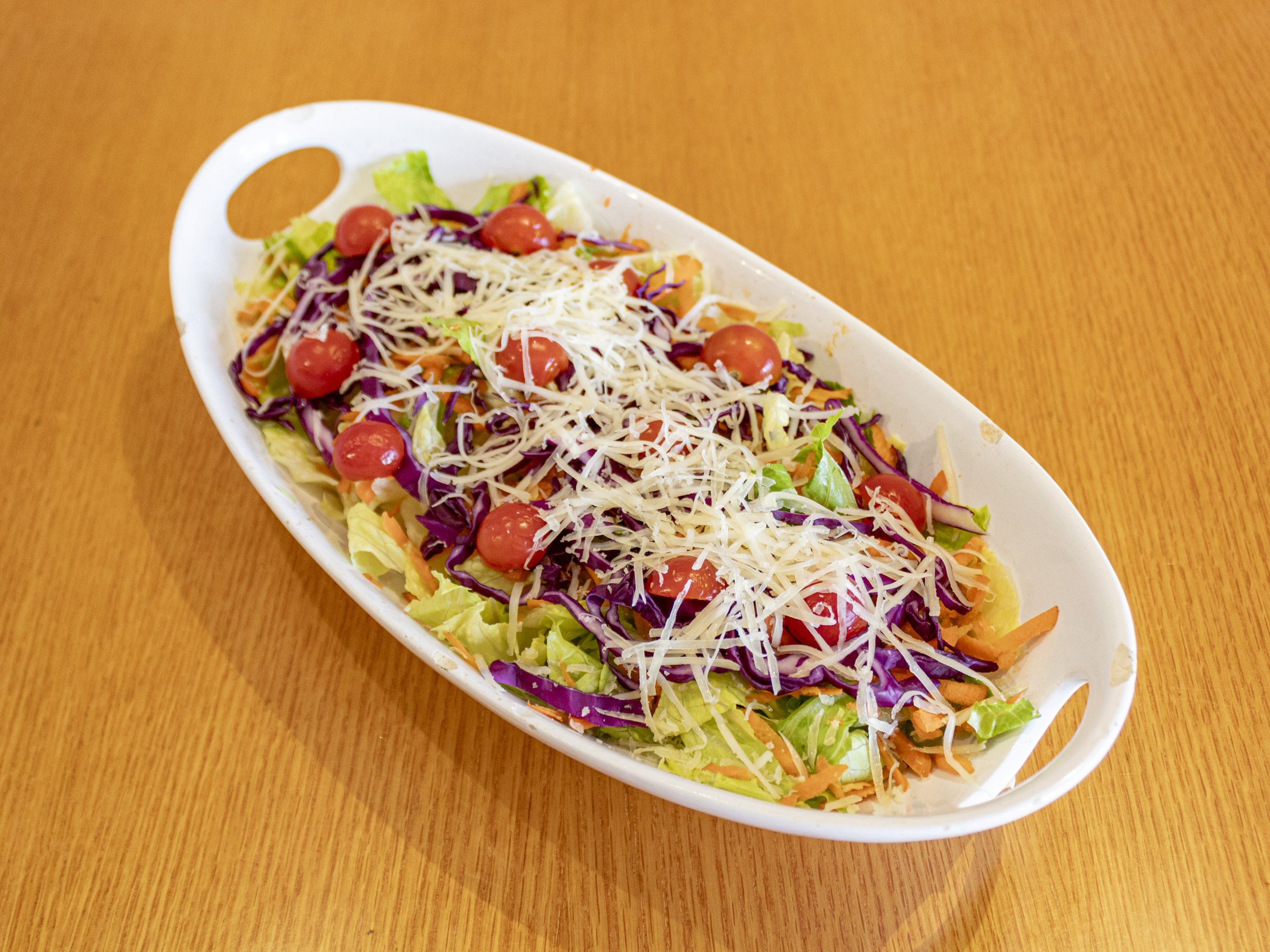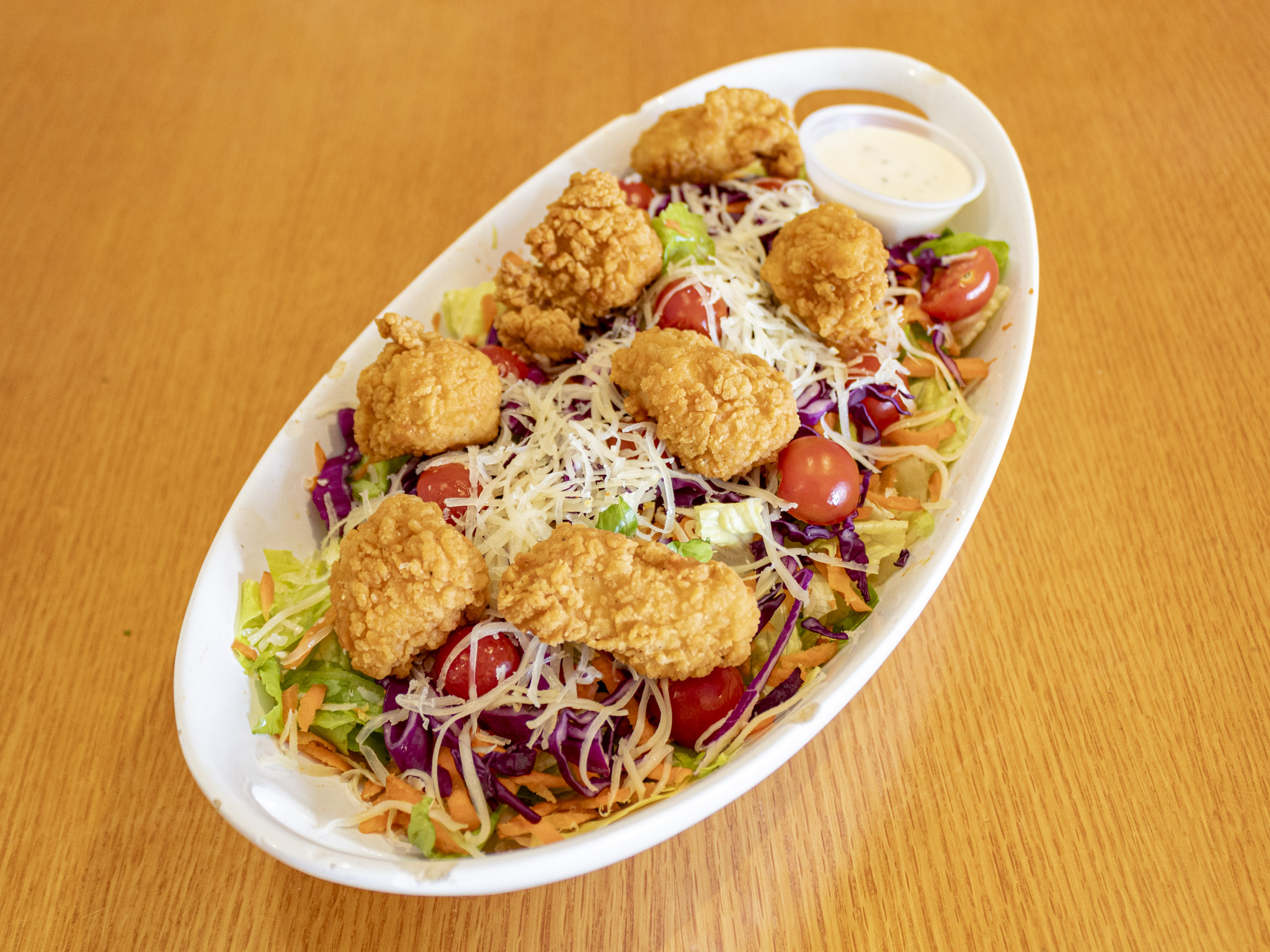 Ensalada mixta con una porción de queso rallado y trozos de boneless bañados en tu salsa favorita