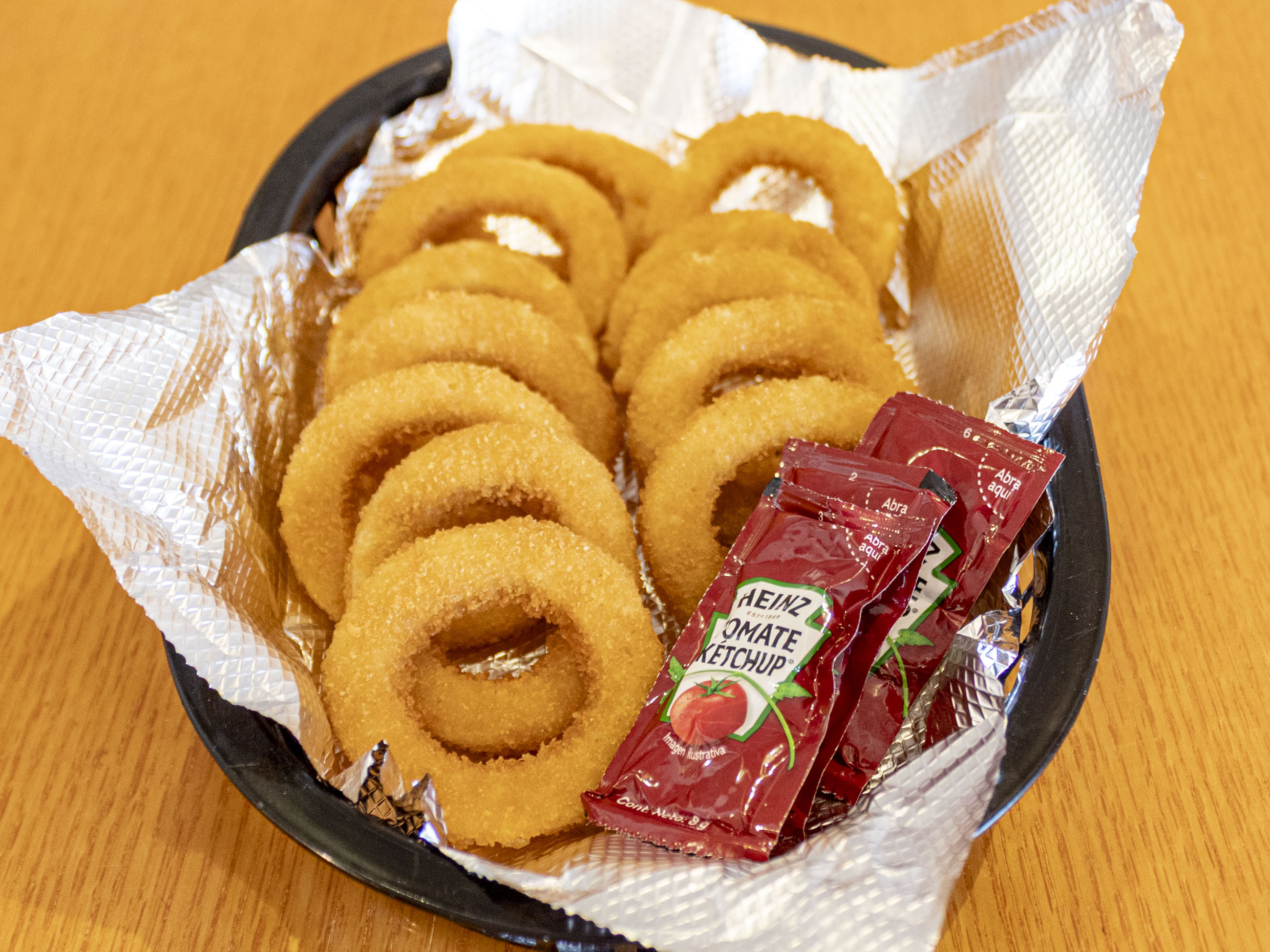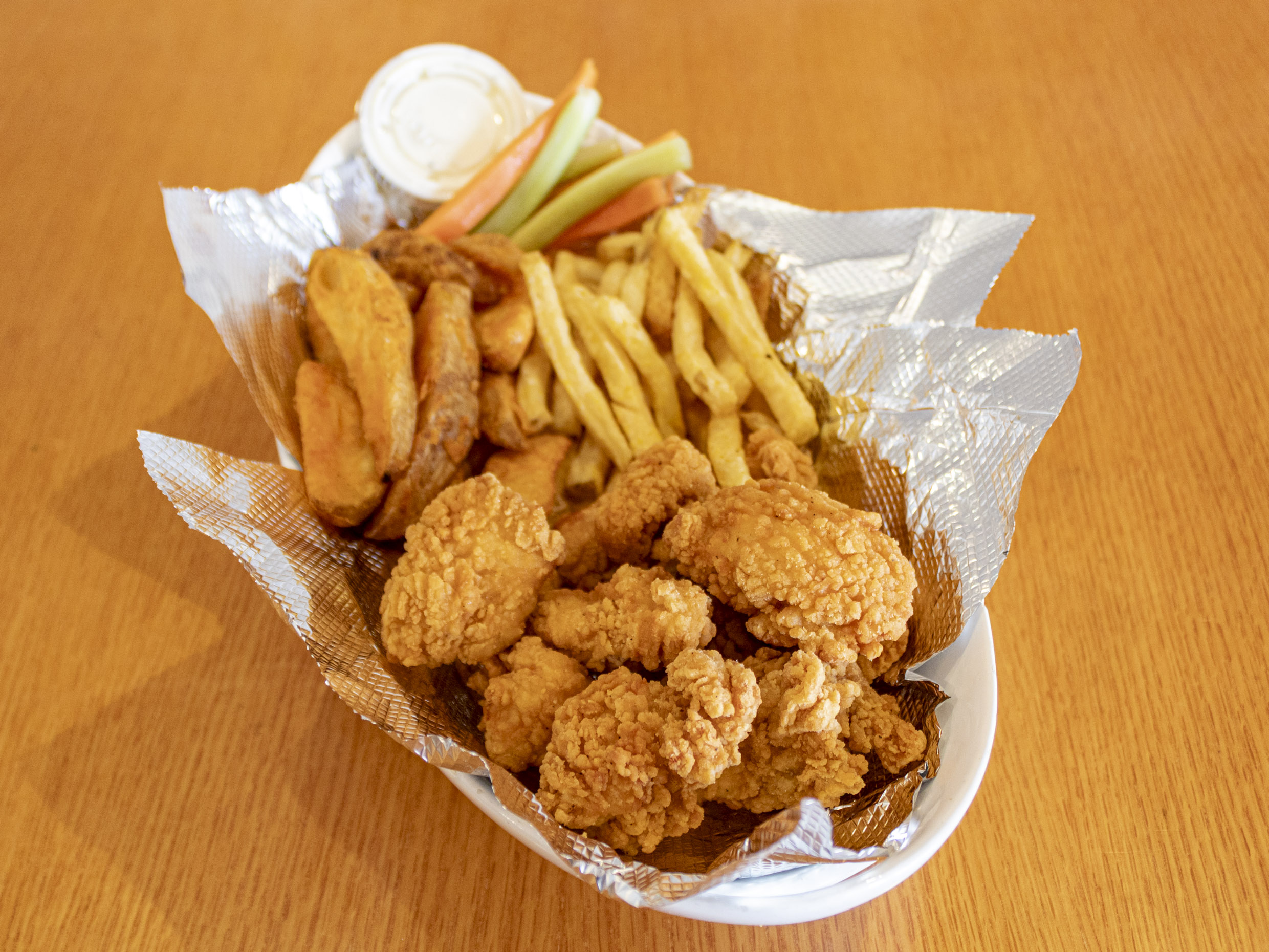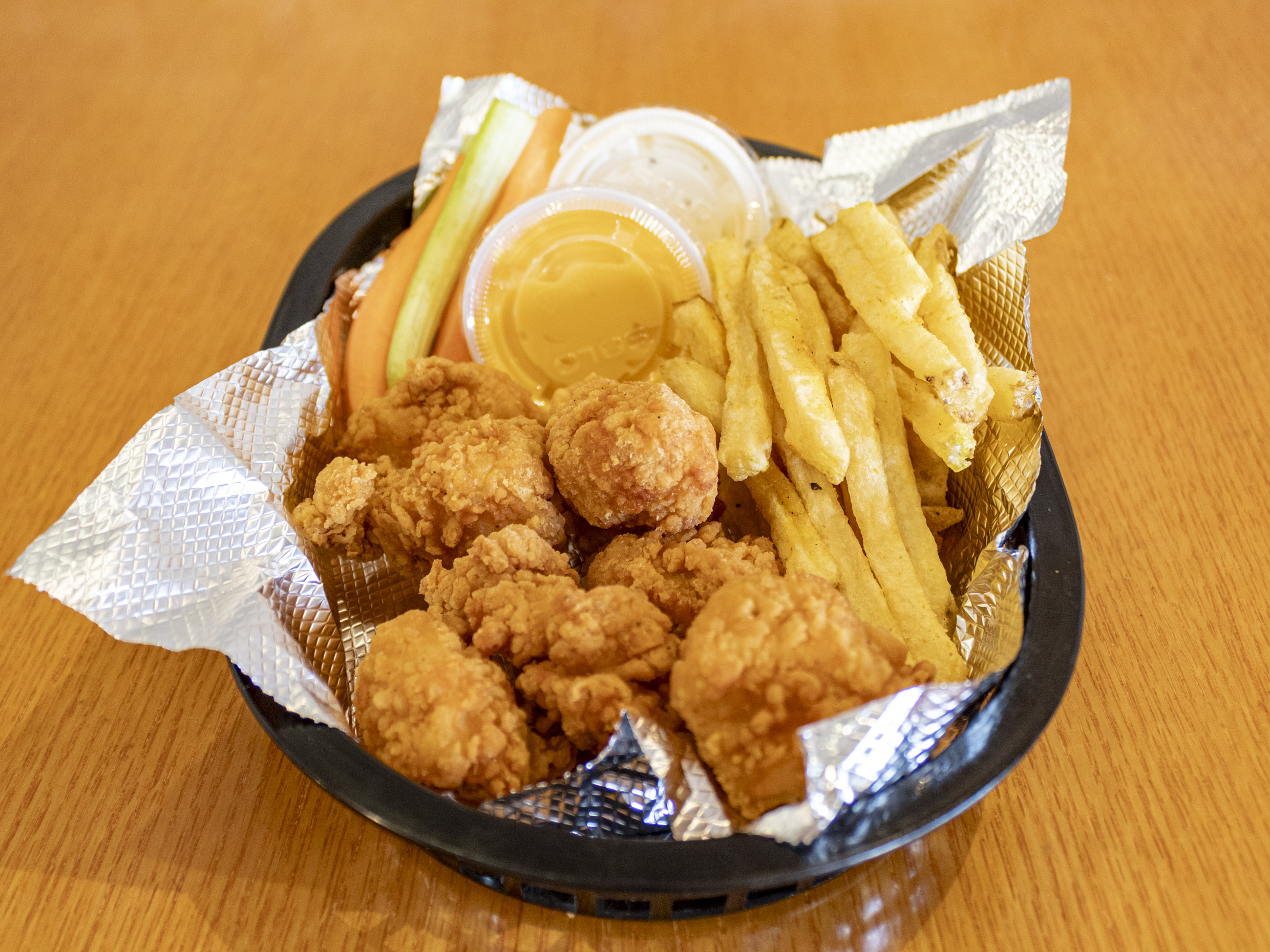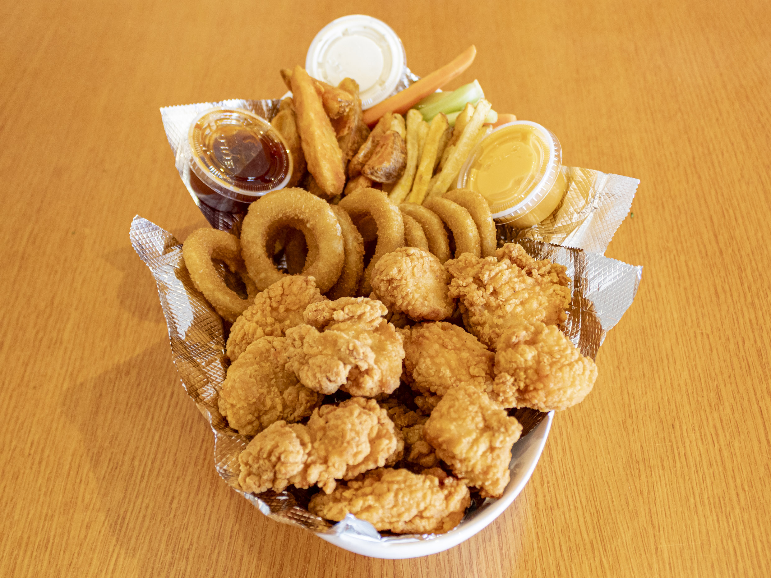 1 KG De Boneless bañados en salsa favorita, acompañados de papas a la francesa, aros de cebolla y papas gajo