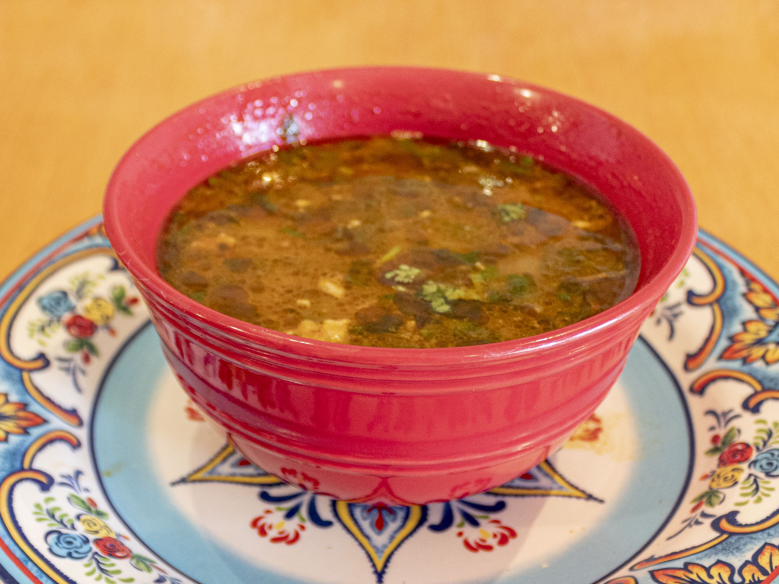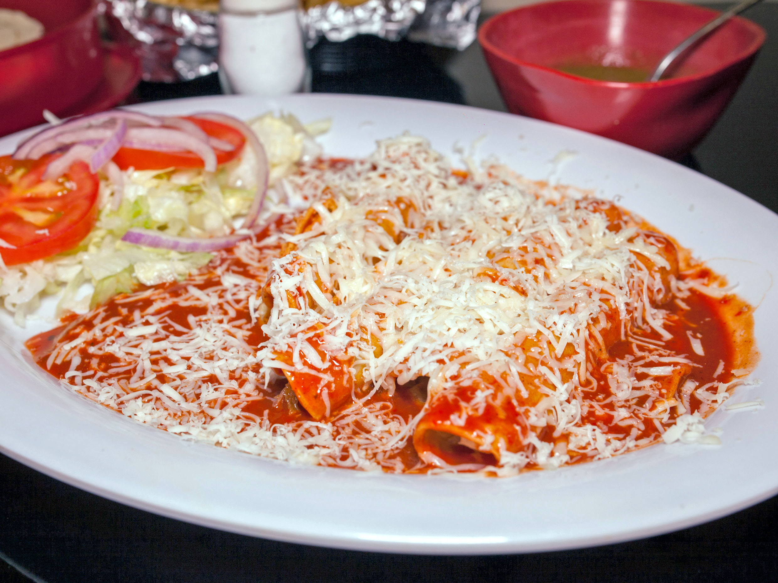 Tortillas doraditas con frijolitos, pollo, lechuga, cebolla y queso