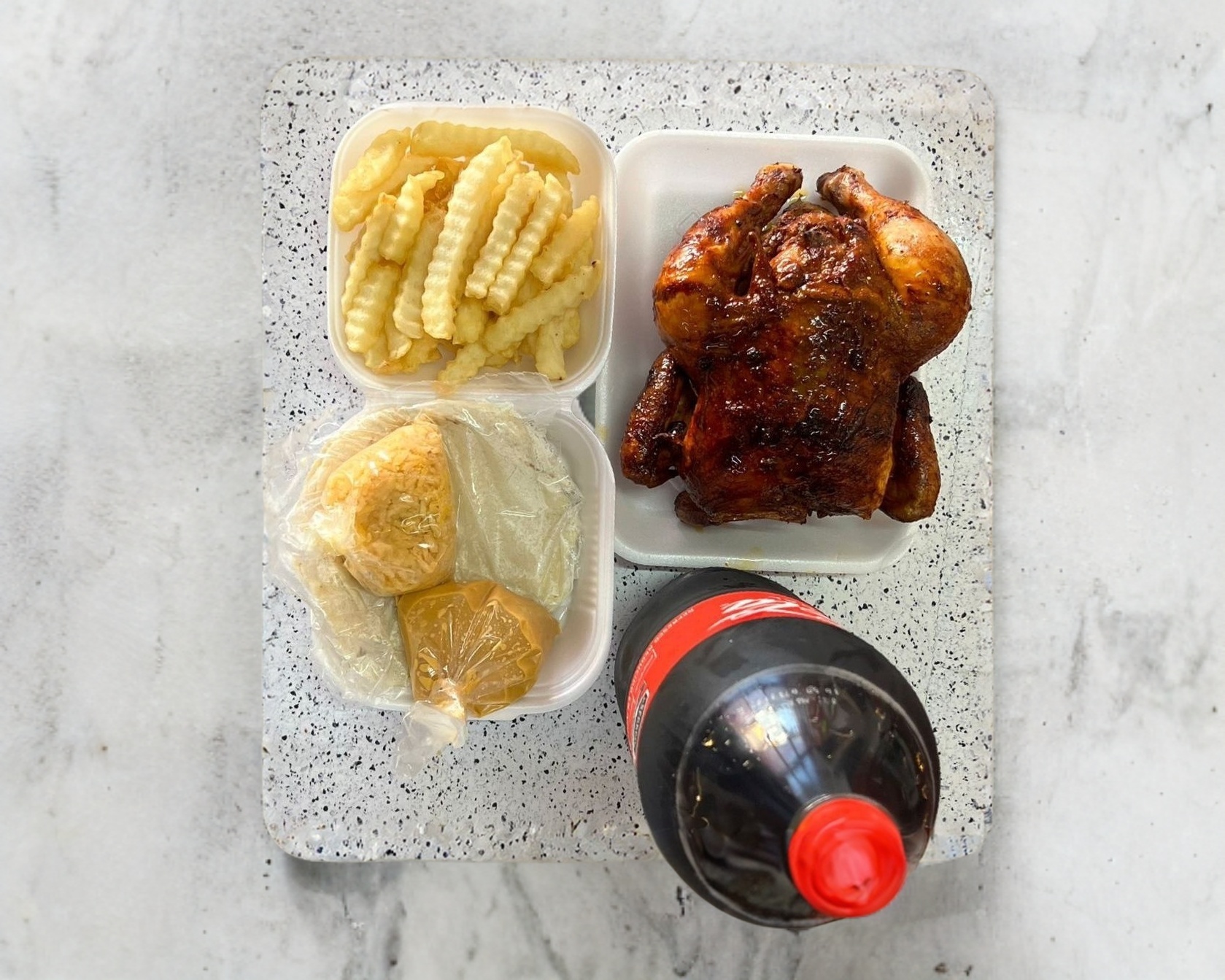 Pollo rostizado con adobo, sal y especias, incluye arroz, salsa y tortillas.