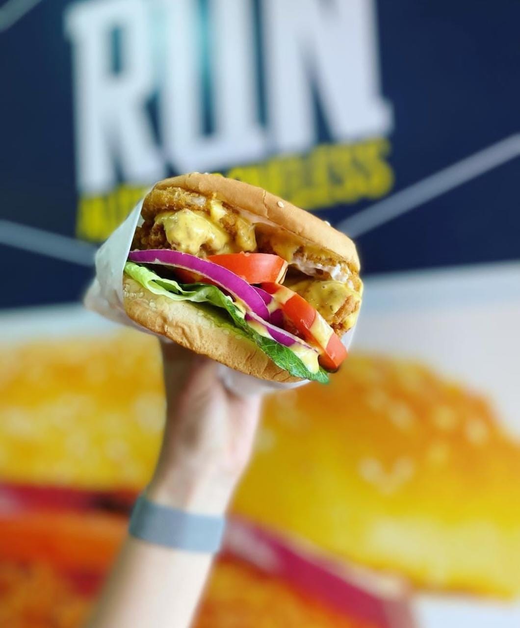 Hamburguesa de pechuga de pollo empanizada y bañada en tu salsa preferida.