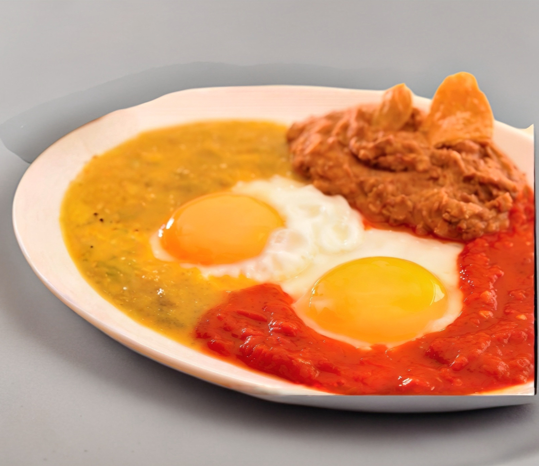 Estrellados sobre una tortilla de maíz, bañados en salsa verde y roja, chilaquiles y frijoles.