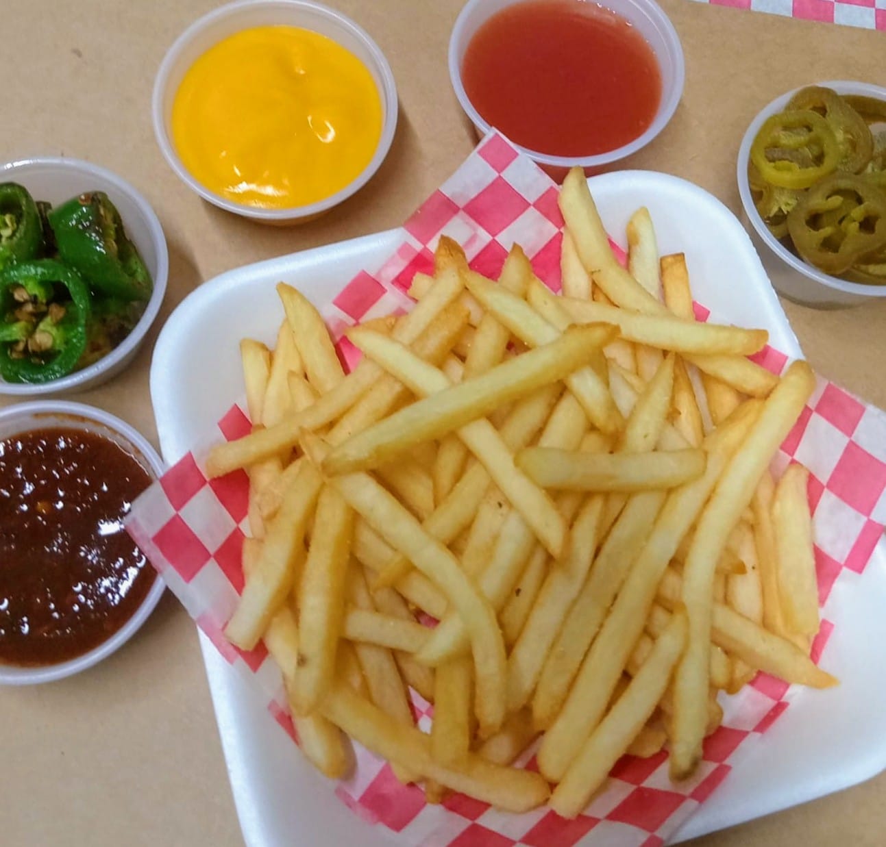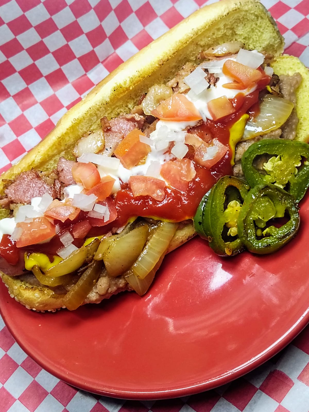 Salchicha jumbo, tocino, frijolitos, tomate, cebolla fresca, cebolla guisada, mayonesa, mostaza y cátsup, servida en un rico pan. ¡Un clásico que encanta!.