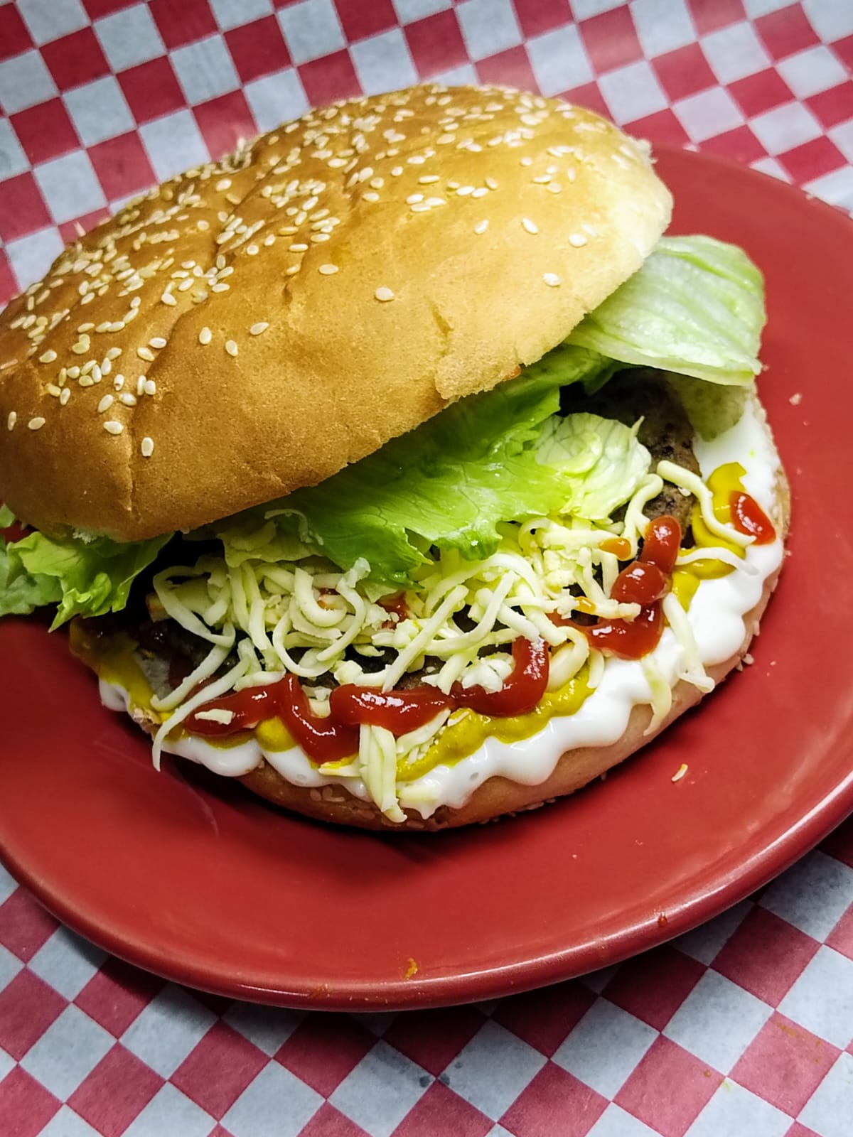 Carne, queso, tocino, lechuga fresca, cebolla guisada, mayonesa, mostaza y cátsup en un pan clásico.