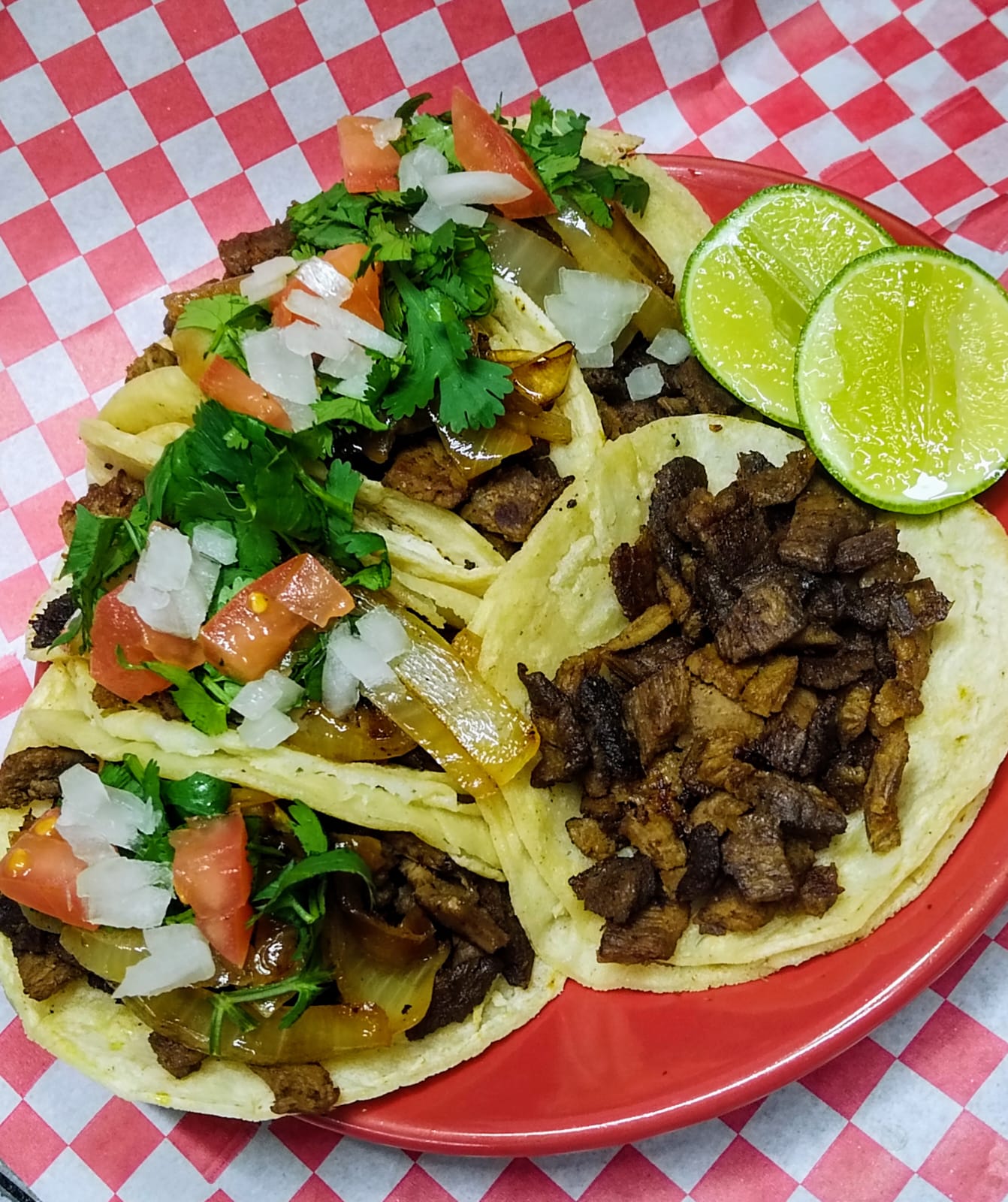 Top sirloin de res, doble tortilla en cada taco, cebolla fresca, cebolla guisada, cilantro, tomate y un toque de limón.