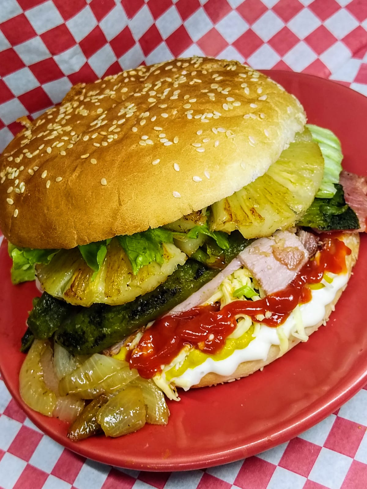 2 Carnes deliciosas, queso fundido, jamón, tocino, piña dulce, lechuga fresca, cebolla guisada, mayonesa, mostaza y cátsup, servidos en un rico pan.