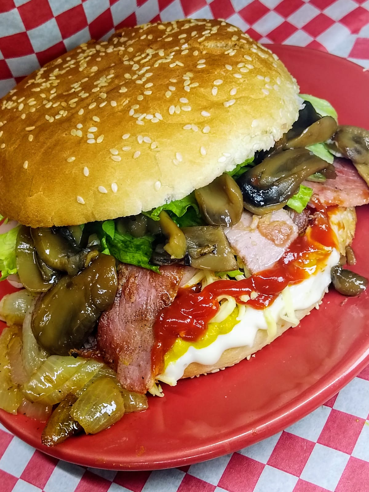 Carne deliciosa, queso derretido, jamón, tocino, champiñones, lechuga fresca, cebolla guisada, mayonesa, mostaza y cátsup en un rico pan.