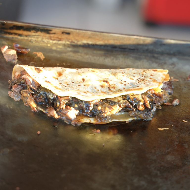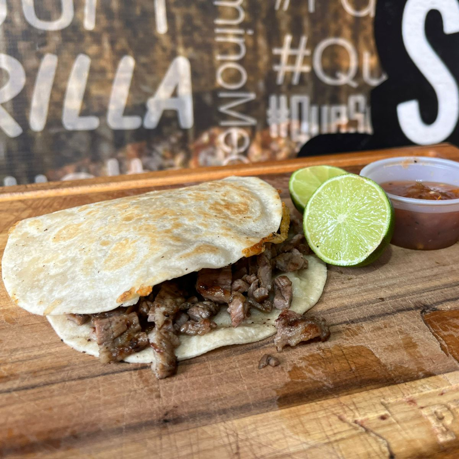 Tortilla de maíz o harina tostada con queso derretido y carne al carbón.