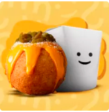 Pelota de arroz empanizada, rellena de aguacate, queso philadelphia, top sirloin y tocino. Bañada en queso cheddar parmesano y chile jalapeño.