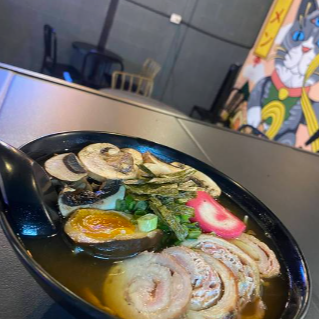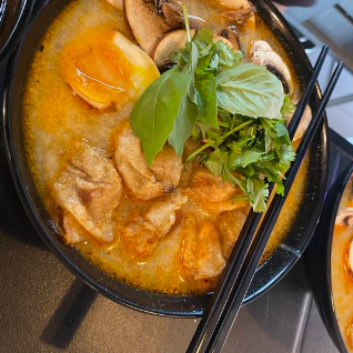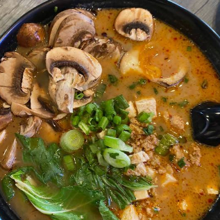 Carne molida de cerdo 100 g y tofu en salsa nam prik pao, fideo plano de trigo, bok choi, hongos, huevo duro, cebollín y alga nori en caldo de cerdo y leche de soya.