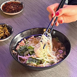 Filete de res 110 g, fideos delgados de arroz en caldo de res y cerdo. Germinado de soya, albahaca y cilantro fresco.
