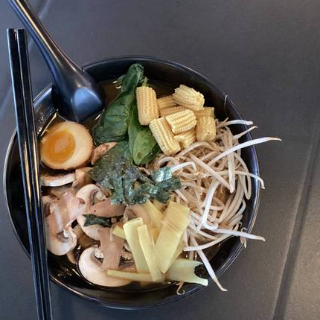 Fideos shuka soba acompañados de hongos, germinado de soya, elotitos baby, espinaca baby, cebollín, alga nori y bambú en caldo de vegetales.