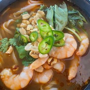 Camarón (6 pz.) y fideos planos de arroz en caldo de res y cerdo con salsa namprik pao. Toque de limón, albahaca, cilantro, cacahuate y serrano.