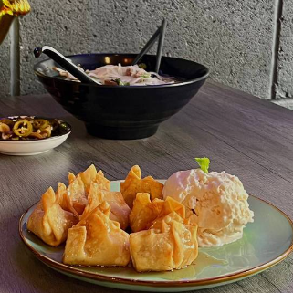 Dumplings rellenos de res y cerdo en caldo de res y cerdo, leche de soja, namprik pao, albahaca, cilantro, hongos, huevo duro, alga nori y fideos de trigo.