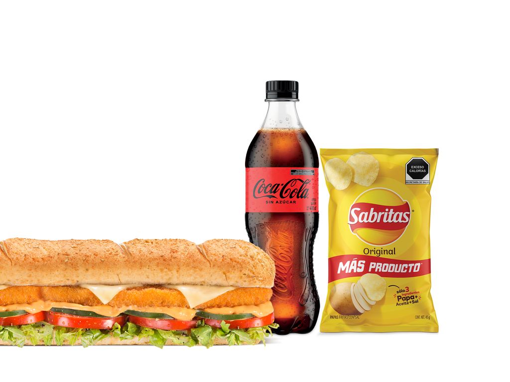Pan integral con tiras de pechuga de pollo estilo teriyaki, doble porción de queso americano, cebollitas crujientes, lechuga, jitomates, pimientos verdes y aderezo de cebolla dulce, más papas o galleta y bebida.