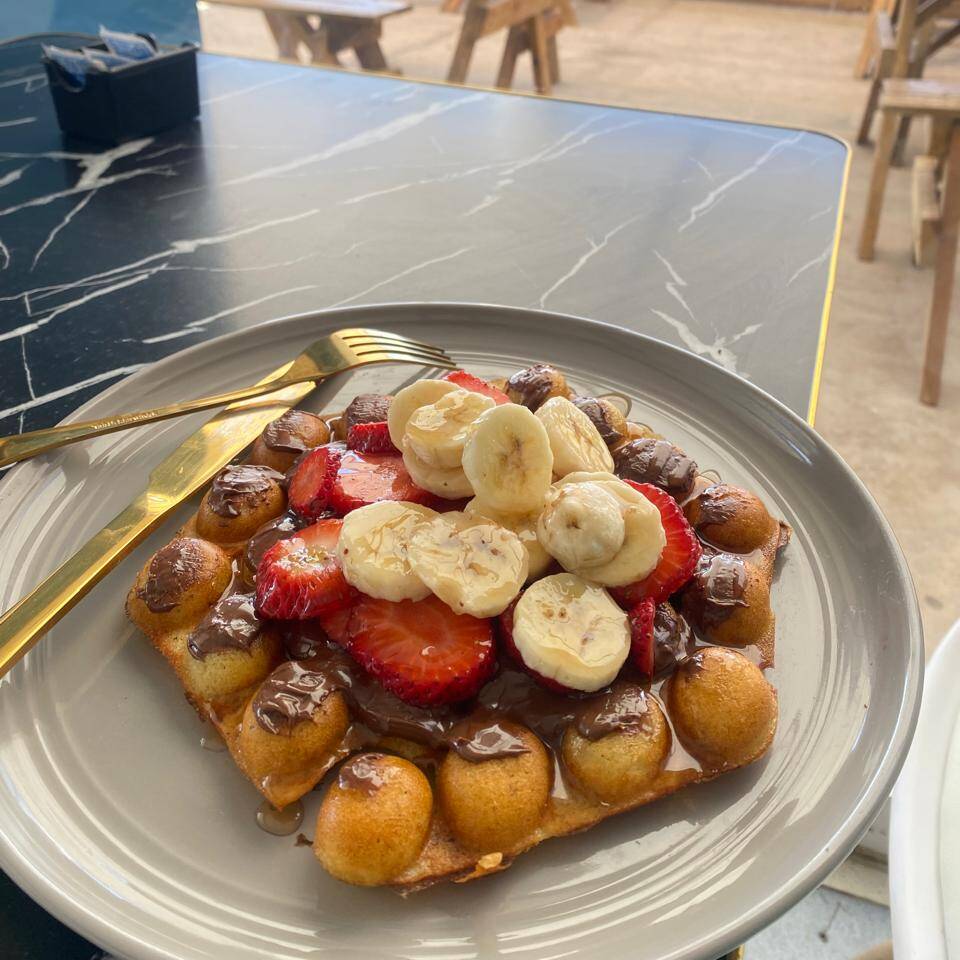 Delicioso bubble waffle montado con fresa, plátano, nutella y bañado con miel maple.