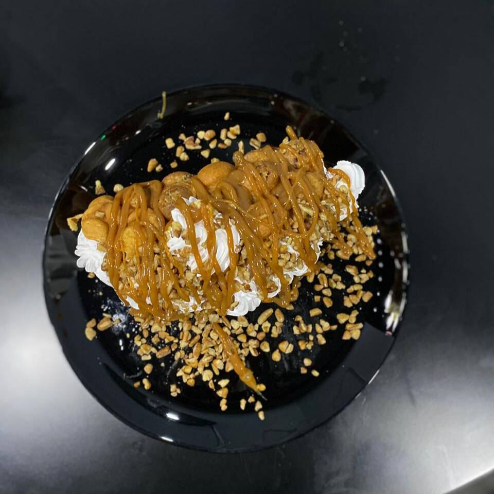 Bubble waffle relleno de nuez, nieve de vainilla, cajeta y crema batida.
