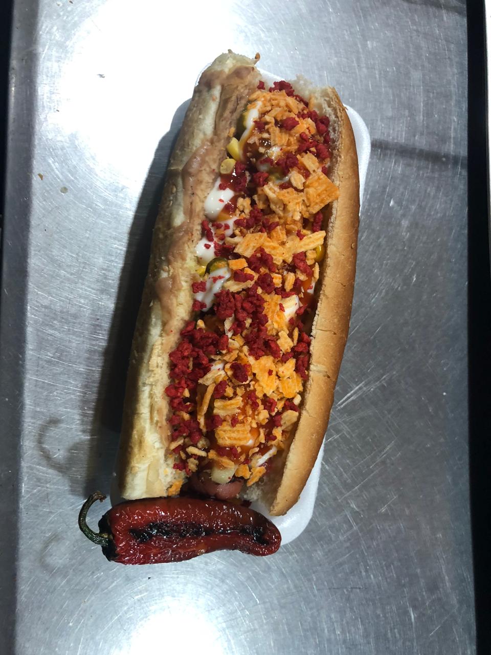 Cebolla, tomate, chilibeans, ruffles, frijoles, mayonesa, mostaza, tocino deshidratado, queso, elote, champiñones más toreados o salsa.